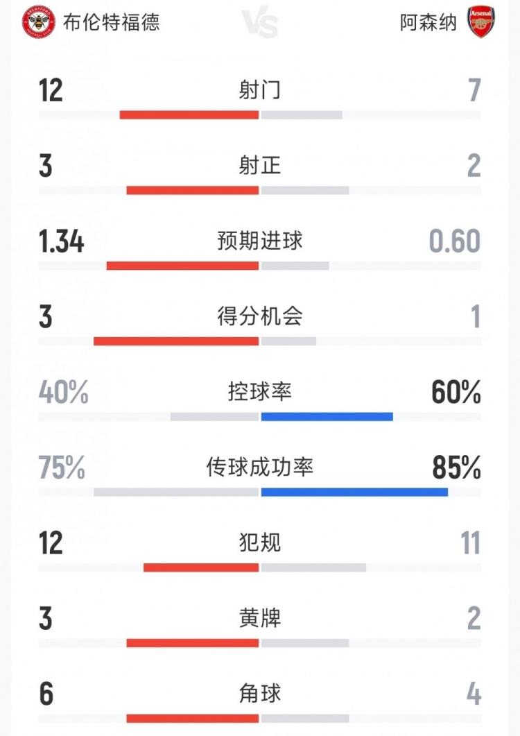 客场1:1战平布伦特福德,阿尔特塔的阿森纳真的被恐惧支配了! 赛前曼城将积分差距追到只有三分,这对阿森纳产生了巨大的心理压力。 面对勇猛的布伦特福德,阿森纳陷入了想赢怕输的尴尬之中,全场被对手压着打。 除了控球率和传球成功率占优之外,阿森纳各项数据全面落后。射门不如对方多、射正不如对方多、得分机会不如对方多、预期进球不如对方多,甚至就连犯规和黄牌也不如对方多。如果不是布伦特福德把握机会能力欠佳,阿森纳根本连一分都拿不到。 与其说阿森纳丢掉了两分,不如说阿森纳抢到了一分更加合适,在全场被对手支配的恐惧中,这样的结果对于阿森纳来说真的非常幸运了!