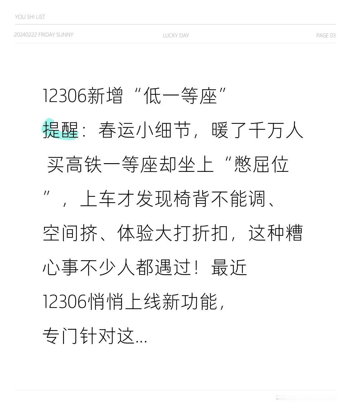 12306新增“低一等座”提醒:春运小细节,暖了千万人 买高铁一等座却坐上“憋屈位”,上车才发现椅背不能调、空间挤、体验大打折扣,这种糟心事不少人都遇过!最近12306悄悄上线新功能,专门针对这类特殊一等座弹出提醒,网友戏称“低一等座提醒”,瞬间冲上热搜,这波操作太贴心! 很多人还不知道,所谓“低一等座”,其实是商务舱后排的特殊席位,属于列车编组的特殊安排。这里空间狭小,椅背无法调节,双人座中间没有隔离扶手,舒适度远不如普通一等座,票价却一样。以前抢票心切,稀里糊涂买下,上车后才后悔莫及,想退换又麻烦,只能一路憋屈到家。 转折来了!12306这次不再让旅客“踩坑”,系统自动识别余票,只要只剩这类特殊一等座,就会弹窗明确告知位置和硬件情况,让大家提前知情、自主选择,不接受可以直接取消重购,不用花冤枉钱、受冤枉气。没有华丽宣传,没有刻意造势,一个小小的提醒,却解决了春运出行的大烦恼。 有人说这只是小事,不值一提。可正是这些不起眼的细节,藏着最实在的用心。春运期间,一票难求,大家奔波在路上,图的就是舒心顺利。12306没有回避问题,而是主动优化服务,把知情权还给旅客,不套路、不将就,让每一笔消费都明明白白,每一次出行都更有尊严。 从优化候补购票,到推出电子客票,再到如今的特殊座位提醒,铁路部门一直在悄悄升级服务,把便利藏在每一个细节里。这不仅是功能的更新,更是对旅客的尊重,是民生服务的温度。 小小的提醒,大大的温暖。出行路上,不一定要多奢华,只求不被坑、不憋屈、不将就。愿每一位春运归人,都能买到舒心票,坐上顺心座,一路平安,顺利团圆!