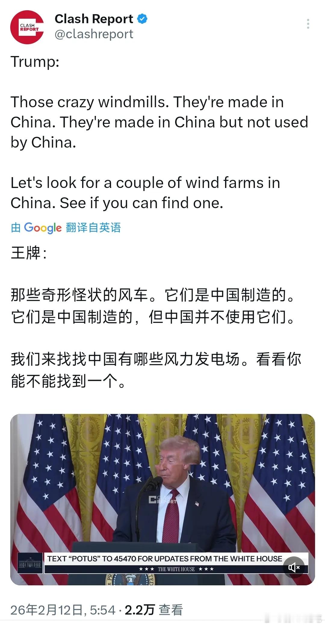 睁眼说瞎话却零成本,美国政客公开造谣为何全无道德压力?近日,美国前总统特朗普在电视访谈中公然造谣:“那些奇形怪状的风车是中国制造的,但中国并不使用它们,你们去找找中国有哪些风力发电场,看能不能找到一个。”这番匪夷所思违背基本事实的言论,再次暴露美国政客为反华而肆无忌惮撒谎的丑样。但是,这类公开造谣在美国政坛早已司空见惯,造谣者毫无道德压力,甚至不影响其政治支持率,可见背后就是美国政治生态、社会舆论与国家治理的全面异化。中国风电的真实实力,早已是全球公认的事实。中国风电制造能力与技术水平稳居全球第一,特别技术领先很大。风电装机容量连续多年全球第一、占全球总量近一半,全球每两台风机就有一台在中国。2025年中国水电、风电、光伏等可再生能源发电量突破4万亿度,规模已接近美国全年总发电量。陆地大风电场、海上巨型风电场,核心零部件到整机制造,特别是风机单机容量,中国遥遥领先,风场规模也遥遥领先,中国风电全产业链领跑世界。特朗普所谓“中国没有风电场”的说法,不仅是睁眼瞎,更是对全球能源行业常识的公然羞辱。然而,如此低级的谎言,短时间内不同场合造谣两次,已经不是口误了,在美国政坛却畅通无阻。造谣者不必道歉、不必更正、不必承担信用破产的后果,支持者MAGA依旧坚定追随,政治基本盘毫不动摇。这说明美国社会早已进入“指鹿为马无所谓”的病态阶段。事实不重要、逻辑不重要、道德不重要,立场与情绪才是唯一标准。所谓正派、诚信、负责的政治伦理,在美国政坛已近乎消亡。政客把造谣当作竞选工具、而抹黑只要政治正确就是可以,选民被极化叙事裹挟,真相被彻底边缘化。长年累月的反华宣传,让造谣抹黑成为美国政治的“条件反射”。新疆棉花、中国信息产品的所谓安全,中国科技进步,美国政客与舆论机器编织出一整套反华谎言体系,日复一日向民众灌输。在信息茧房与算法投喂下,多数美国人活在被筛选、被扭曲的信息环境里,对中国的真实发展一无所知,对国际常识漠不关心。反华谎言堂而皇之登上主流平台,习惯成自然,最终让整个社会丧失辨别真伪的能力。一个社会造谣成为政治常态、愚民成为治理手段,那美国的衰落已是必然。一个靠谎言驱动、靠对立维系、靠蒙蔽民众维持统治的国家,不可能拥有持久的创新力、凝聚力与国际公信力。政治诚信崩塌、社会共识撕裂、治理能力退化,只会让美国在自我封闭与自我消耗中不断下坠。特朗普式造谣不是偶然失误,实际上反映了美国制度性腐朽的集中暴露;没有道德压力的政客背后,是一个正在走向空心化、虚伪化、衰落化的美国。真相不会被谎言淹没,而美国政客每一次肆无忌惮的造谣,都是在给自己的国家敲响衰落的钟声。