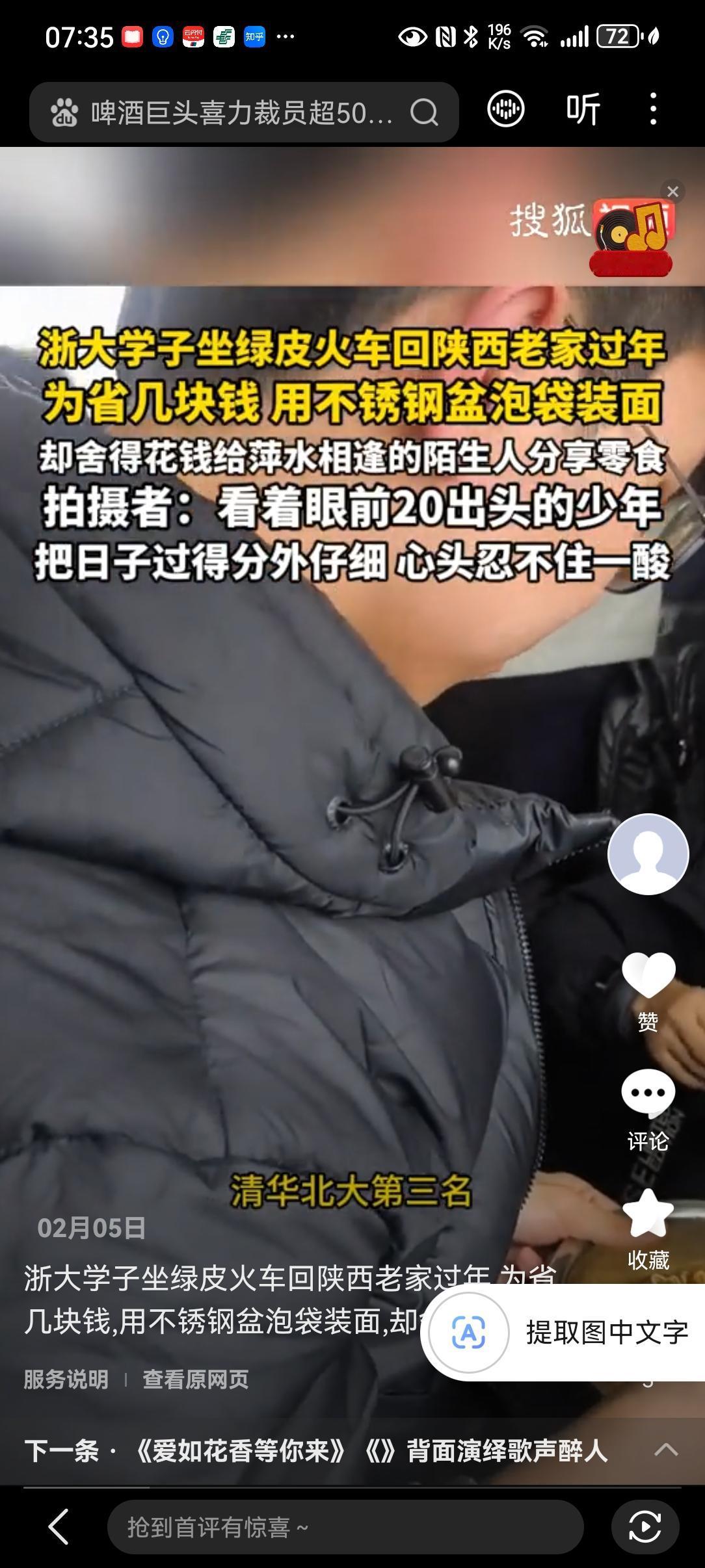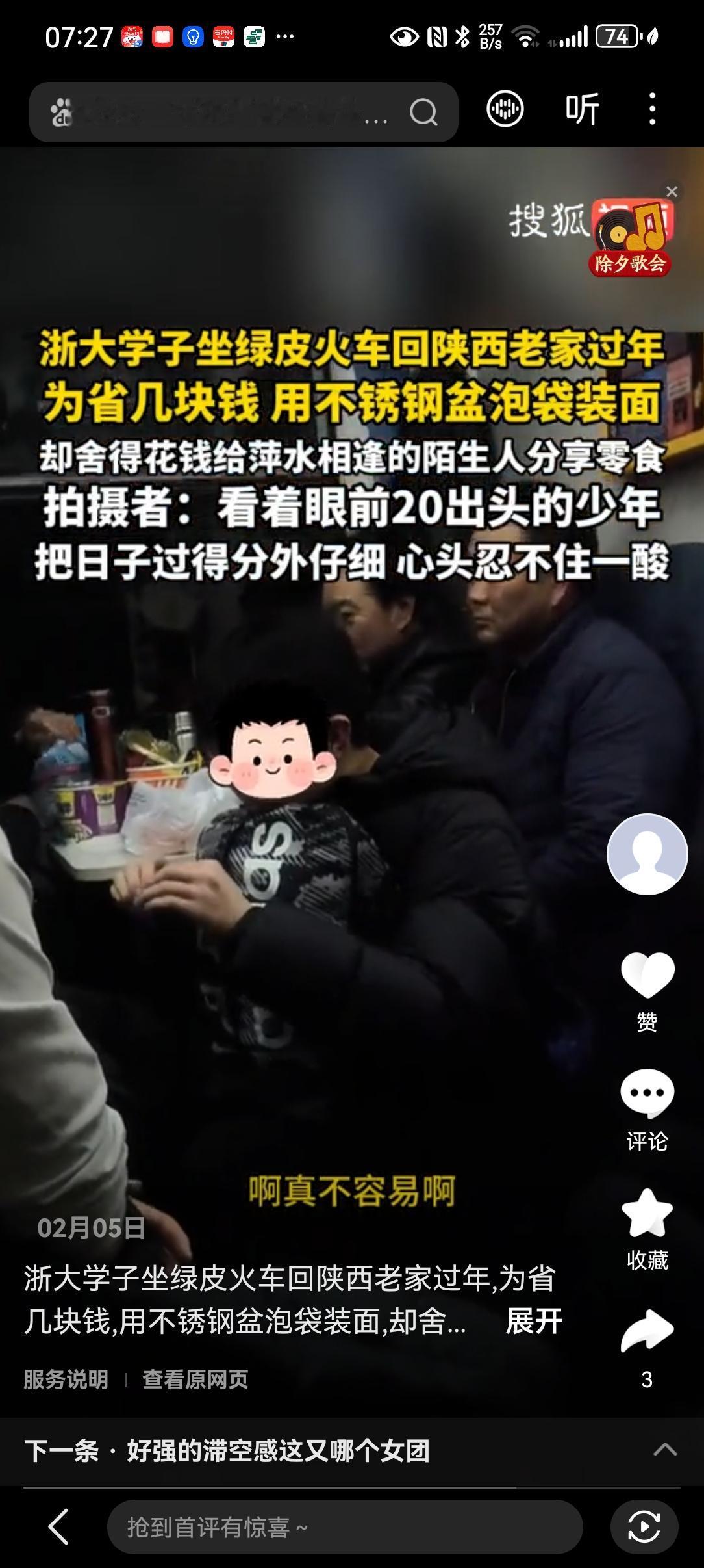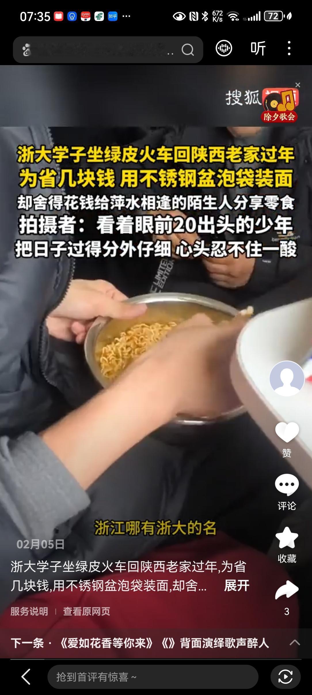 谁能想到,一趟绿皮火车,竟装下了中国人最实在的年。 浙大大二学生小杨,陕西娃,高考六百七十九分。 春运回家,他揣着不锈钢盆,泡袋装泡面,省一块是一块。 同车厢有打工的大叔,有带娃的妇人,一路沉默拥挤。 他却把攒下的零食,一一分给身边陌生人,十几块钱,不多,却暖得烫人。 有人说他寒门贵子,我倒觉得,这是刻在骨里的教养。 惜钱,是懂生活的苦;肯分享,是知人间的暖。 车到西安站,他背起旧书包,消失在人流里。 没有豪言,没有摆拍,只留下一车厢的热乎气。 这世上最动人的,从不是光鲜亮丽。 是穷不丢善心,难不忘旁人,是平凡人藏在细节里的温良。 一年到头,奔忙辛苦。 愿每个赶路的人,都被温柔以待,都能平安团圆。