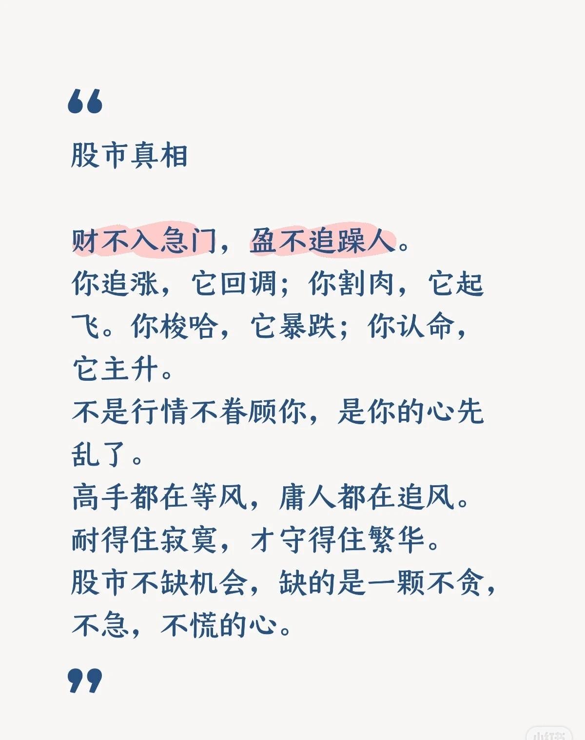 股市里,技术只是工具,真正决定胜负的,是你的心。 财不入急门,盈不追躁人——追涨杀跌,往往买在高点、卖在低点。 机会常有,缺的是不贪、不急、不慌的心态。 高手等风,庸人追风;稳住自己,比看懂K线更重要。 投资不是跟市场比输赢,而是跟自己的贪婪、恐惧、急躁较劲。 心稳了,路就顺了。