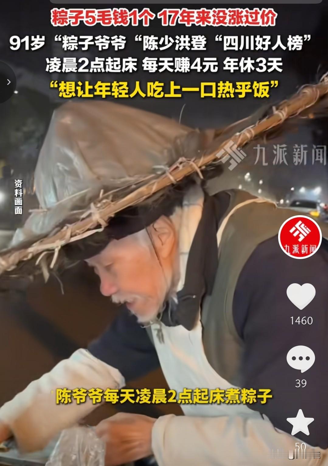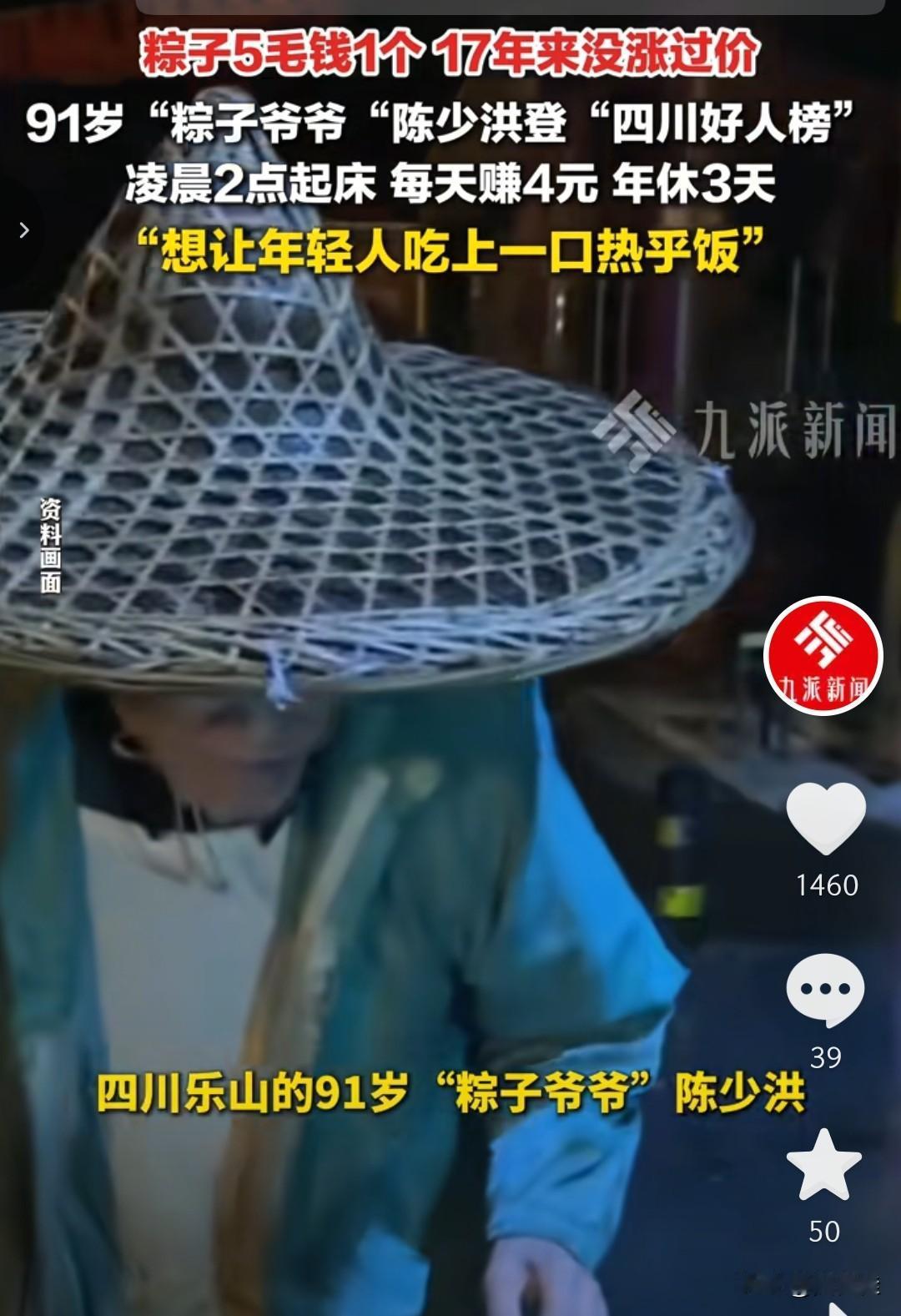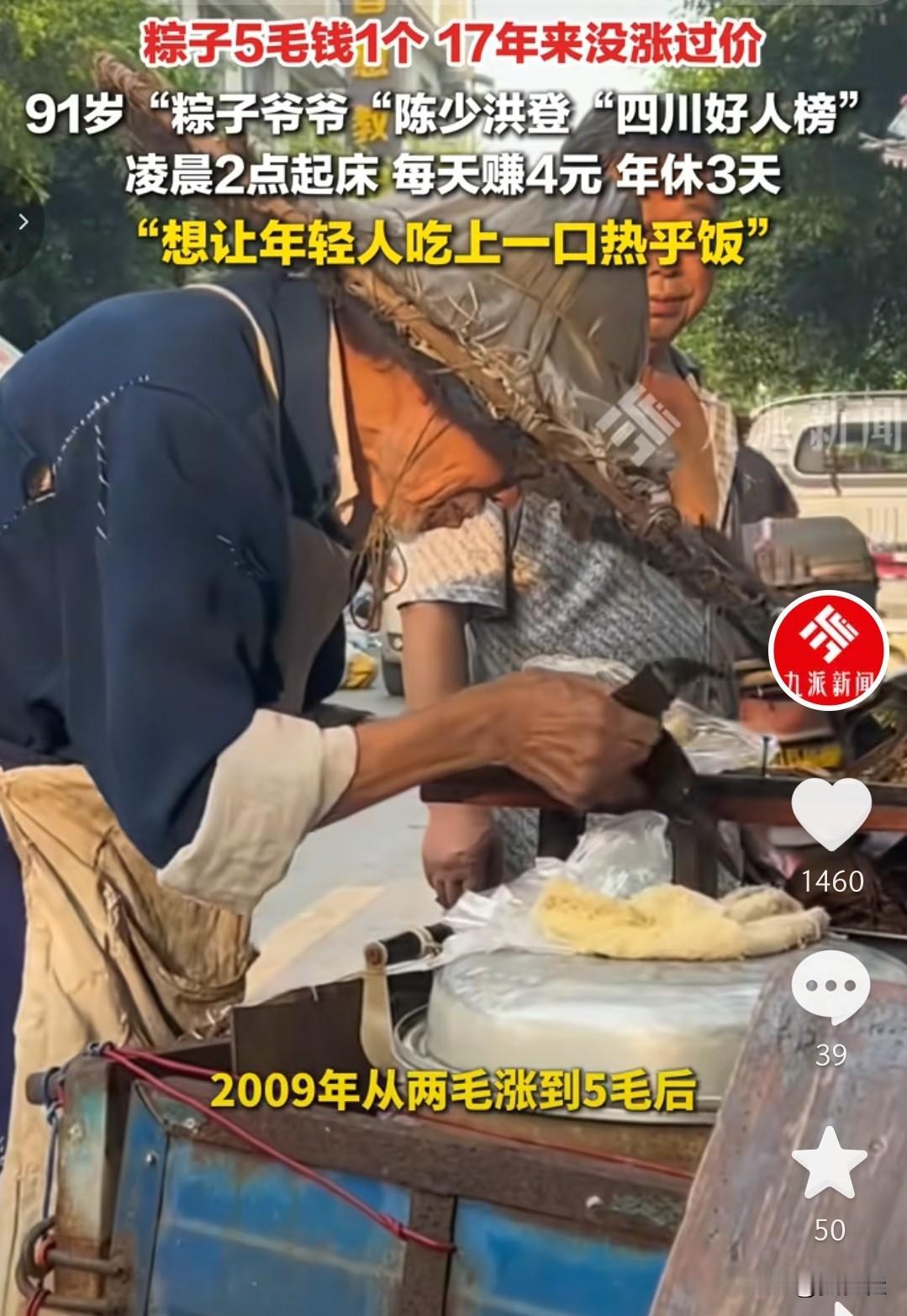 四川乐山91岁的“粽子爷爷”,获评“四川好人榜”,真的太暖心了。他卖粽子17年没涨价,一直5毛钱一个,每天只赚4块钱,一年只休息3天。 爷爷每天凌晨2点就起床煮粽子,5点半准时出摊。2009年从2毛涨到5毛后,就再也没涨过价,一个粽子利润只有四五分钱。身边人都劝他涨价,可爷爷说自己生活够用,就想让年轻人能吃上一口热乎饭。 真心感谢爷爷这么多年的坚持和善意,祝您健康长寿、平安顺遂。