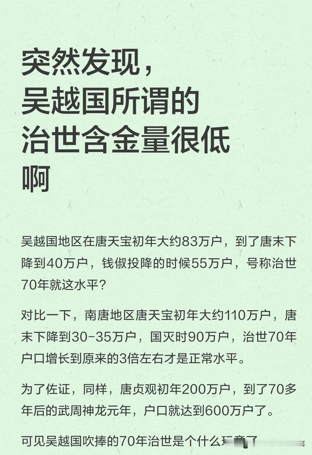 看太平年 总刷到把吴越国吹成五代十国第一治世的,翻完史料才发现,这“太平盛世”的水分真不是一般大。 先看最核心的户口数据,最能说明问题: 吴越天宝初年约83万户,唐末跌到40万户,钱俶纳土归宋时才55万户。号称七十年治世,户口就这点增长?对比下南唐,天宝初年110万户,唐末只剩30-35万户,亡国时恢复到90万户;再看大唐贞观到武周,七十多年户口从200万涨到600万,正常治世该有的增长,吴越国根本没达到。 再看实打实的民生,更是一言难尽。 吴越地狭人稠,平原面积还不到南唐十分之一,为了支撑一隅捍四方的开销,从钱镠开始就重敛于民,苛捐杂税多到离谱。小到鸡鱼蛋雏、柴米蔬果,甚至箕帚之类的杂物都要征税,而且是家至日取,百姓躲都躲不掉。 交不上税就严刑逼债,官吏抱着账簿列队唱数,欠多少就打多少,少则几十鞭,多则上百鞭,苦不堪言。同时还大肆掠夺岭南海上商人的宝物,赋税纸面就是亩收三斗,是中原的三倍;兵制更是五户养一兵,比中原十户一兵重了一倍,土地兼并也在诸国里排前列。 说它没大规模战乱没错,毕竟长期称臣纳贡,和南唐虽有冲突,但确实比中原乱世安稳。可安稳≠治世,百姓不过是用重税酷刑换了条活命,比起中原丢性命是好点,但离真正的盛世差太远。 而且当时户口隐匿现象严重,单从数据就能看出来,所谓治理能力被严重高估。五代十国本就是乱世,吴越能保一方相对安定值得肯定,但硬吹成完美治世,真的站不住脚。 唯物史观看,吴越的安稳更多是天时地利,不是治理有多高明。别再被影视剧和美化文案带偏了,细节大多是编的,还原真实的吴越,才对得起那段历史。 话说回来,你觉得五代十国里,真正能算“百姓好日子”的政权有几个?