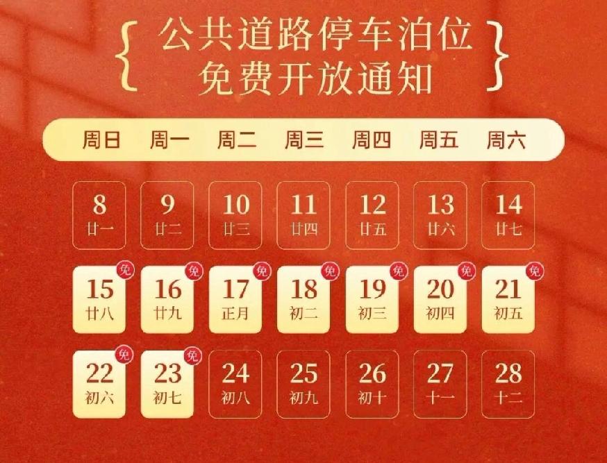 天南地北大拜年近日,青岛城阳停车发布通知,春节期间,城阳区公共道路停车泊位将面向公众免费开放。免费开放时间为2026年2月15日至2月23日(农历腊月廿八至正月初七),不包括公共封闭停车场。自2026年2月24日(正月初八)起,将恢复正常收费管理。