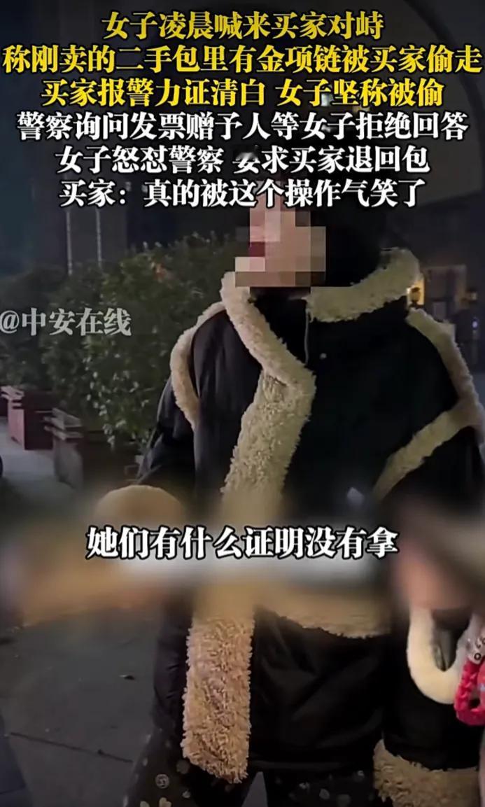 2月10日,河北。女子凌晨喊来买家对峙,称刚卖的二手包里有金项链被买家偷走,买家报警力证清白,女子坚称被偷,警察询问发票赠予人等女子拒绝回答,女子怒怼警察,要求买家退回包,买家:真的被这个操作气笑了。 大半夜的街头,冷风刮得人直打哆嗦,两边人就这么僵着。女子裹着带毛领的厚外套,一口咬定自己的金项链就放在那个二手包里,是买家趁她不注意偷走的。她越说越激动,指着买家的鼻子骂,说对方“贪小便宜”“不要脸”,完全不听对方解释。 买家这边也是一肚子委屈。本来开开心心买个二手包,结果刚交易完就被人半夜叫出来对峙,还被扣上“小偷”的帽子。为了自证清白,他们主动报了警,配合警察检查随身物品,甚至同意去派出所做进一步调查,可女子就是不依不饶,一口咬定“就是你们偷的”。 警察来了之后,问她金项链的发票在哪、是谁送的、什么时候放进去的,她要么支支吾吾,要么直接怼回去:“我凭什么告诉你?”当警察让她拿出证据时,她反而理直气壮地反问:“她们有什么证明没有拿?”这种“我没证据但你必须自证清白”的逻辑,真的让人又气又笑。 说白了,这就是典型的“我弱我有理”。自己没保管好东西,不想着反思,反而把责任全推到别人身上,用撒泼打滚的方式逼别人妥协。二手交易本身就有风险,交易前双方都应该仔细检查物品,确认无误后再完成交易。一旦交易完成,再回头说东西少了,除非有确凿证据,否则真的很难让人信服。 更让人无语的是,她面对警察的调查不仅不配合,还怒怼执法人员,这种行为不仅解决不了问题,还可能让自己承担法律责任。在法治社会,凡事都要讲证据,靠撒泼耍赖是赢不了道理的。 遇到这种不讲理的人,你跟她讲法律,她跟你耍无赖;你跟她讲道理,她跟你卖惨。最后只能通过法律途径来维护自己的权益,可这中间耗费的时间和精力,又该找谁算呢? 这件事也给我们提了个醒,不管是线上还是线下交易,都要多留个心眼。交易前仔细检查物品,最好能有第三方见证或者拍照录像留证,避免后续出现纠纷。同时,也要学会用法律武器保护自己,遇到不讲理的人,不要跟她纠缠,直接报警才是最明智的选择。 各位读者你们怎么看?欢迎在评论区讨论。