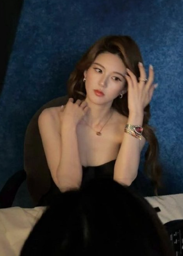 一袭墨色衣裙如古典画作里的深海 绸缎是夜风织就的第二层肌肤,贵气缀于颈间与指梢,珠宝的呼吸比月色更沉静