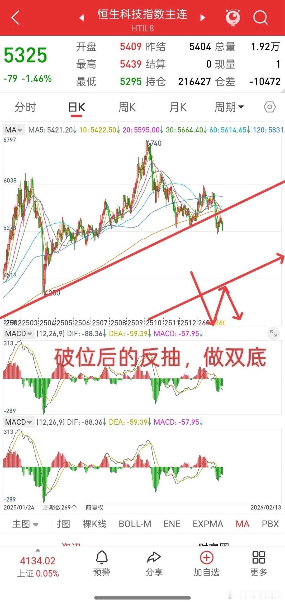 昨晚香港股指期货跳水,以恒生科技为主,它就是前期破年线,以及上升趋势支撑,然后加速下跌,前几天反弹,这两天下跌,就是破位后的反抽,有做双底迹象,未来只有站上年线才能积极看好,不然年线下方就是筑底。