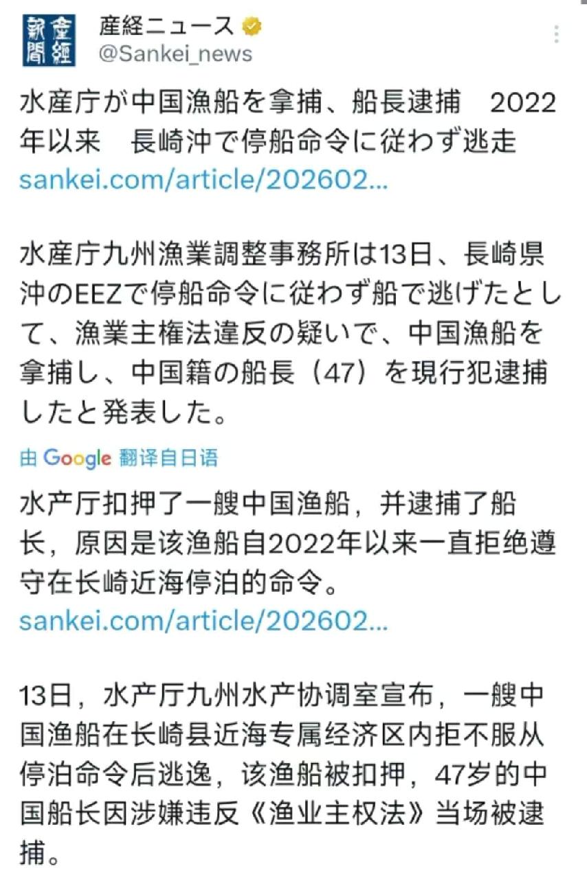 2月13日,日媒报道:“水产厅扣押了一艘中国渔船,并逮捕了船长,原因是该渔船自2022年以来一直拒绝遵守在长崎近海停泊的命令。2月13日,水产厅九州水产协调室宣布,一艘中国渔船在长崎县近海专属经济区内拒不服从停泊命令后逃逸,该渔船被扣押,47岁的中国船长因涉嫌违反《渔业主权法》当场被逮捕。” 东海渔业再起风波——法理之外,更要守好合作底线!周五日本在长崎近海扣押中国渔船、逮捕船长,成为中日海上摩擦新焦点。回顾2010年钓鱼岛渔船事件,此类执法极易激化情绪。数据显示,近年中日渔业纠纷本呈下降趋势,此次突然强硬执法,打破了相对平稳的局面。 东海渔业秩序,依托中日渔业协定与国际法框架,争议海域更应沟通先行。单边抓人扣船,既伤害渔民权益,也冲击双边互信。当前地区局势复杂,海上摩擦更易放大风险。中方必将依法护渔、全力维权。希望日方恪守协定,冷静处置,别让个别事件升级,更别破坏来之不易的缓和大局!