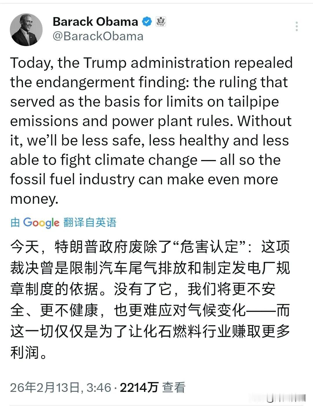 美国前总统奥巴马今天(北京时间2月13日)发文写道:“今天,特朗普政府废除了‘危害认定’:这项裁决曾是限制汽车尾气排放和制定发电厂规章制度的依据。没有了它,我们将更不安全,更不健康,也更难应对气候变化而这一切仅仅是为了让化石燃料行业赚取更多利润。” 评几句: 奥巴马点名批评!特朗普废除气候核心政策,只为利益集团牟利? 美国前总统奥巴马公开表态,直指特朗普政府废除“温室气体危害认定”,是用全民健康换取少数行业利润。 这不是普通的政策调整,而是从根本上动摇美国气候治理的法律基石。斩断温室气体与公共健康的关联,本质上是把科学共识拖进政治博弈的泥潭。 特朗普声称此举能降低成本、让民众受益,可这笔账太过短视。极端天气、环境污染、公共卫生风险,最终都会变成整个社会的沉重代价。用未来的巨额成本,换取当下少数群体的利益,是对后代福祉的透支。 奥巴马一句“为了利润牺牲健康”,可谓一针见血。放弃环保责任、无视全球共识,这种开历史倒车的行为,不仅损害美国自身公信力,也给全球气候治理带来阻碍。 保护环境从来不是选择题,而是关乎未来的必答题。漠视科学、透支未来,终究会被时代所否定。