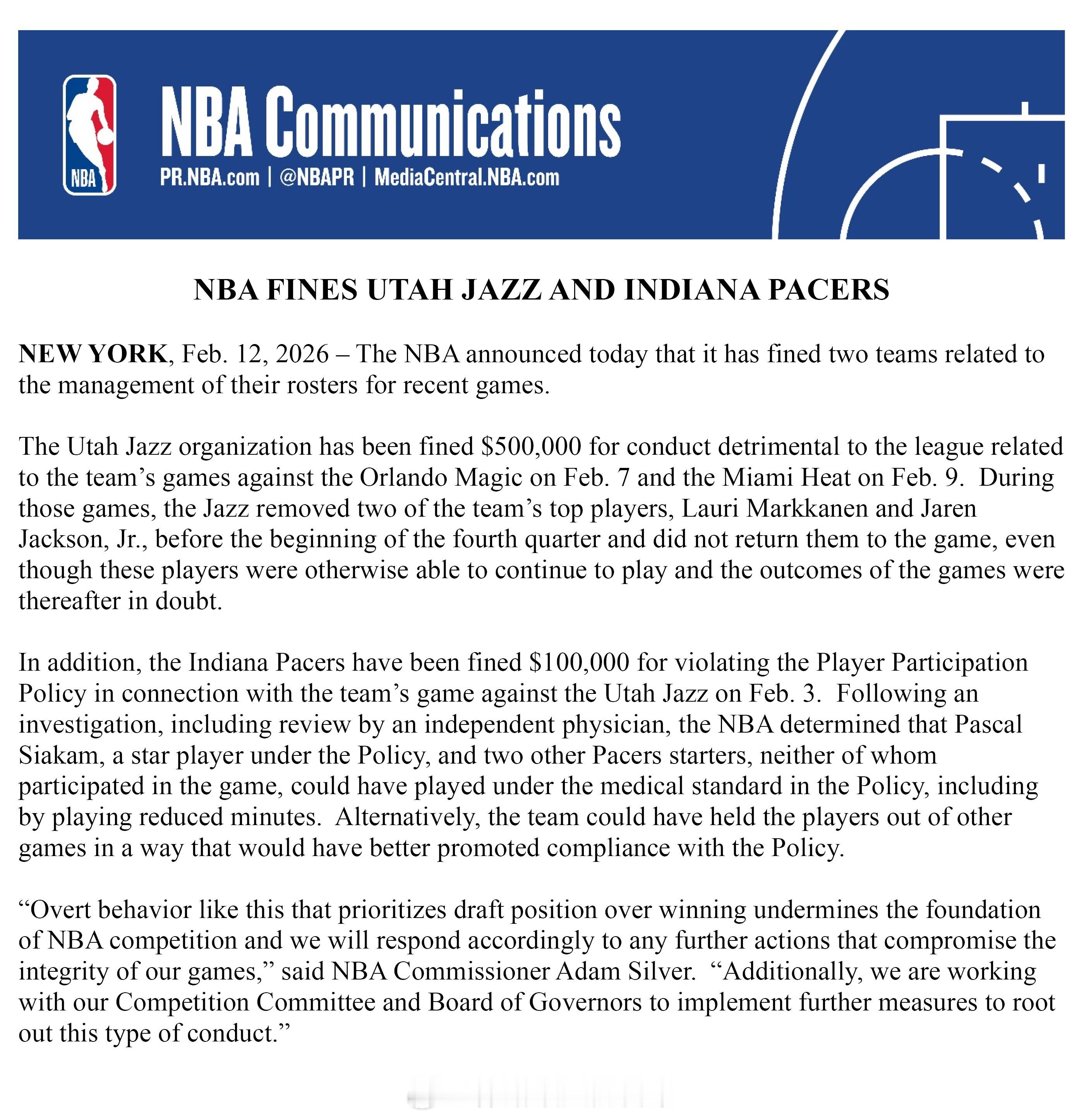 NBA官方对爵士、步行者轮休球员,分别罚了50万和10万