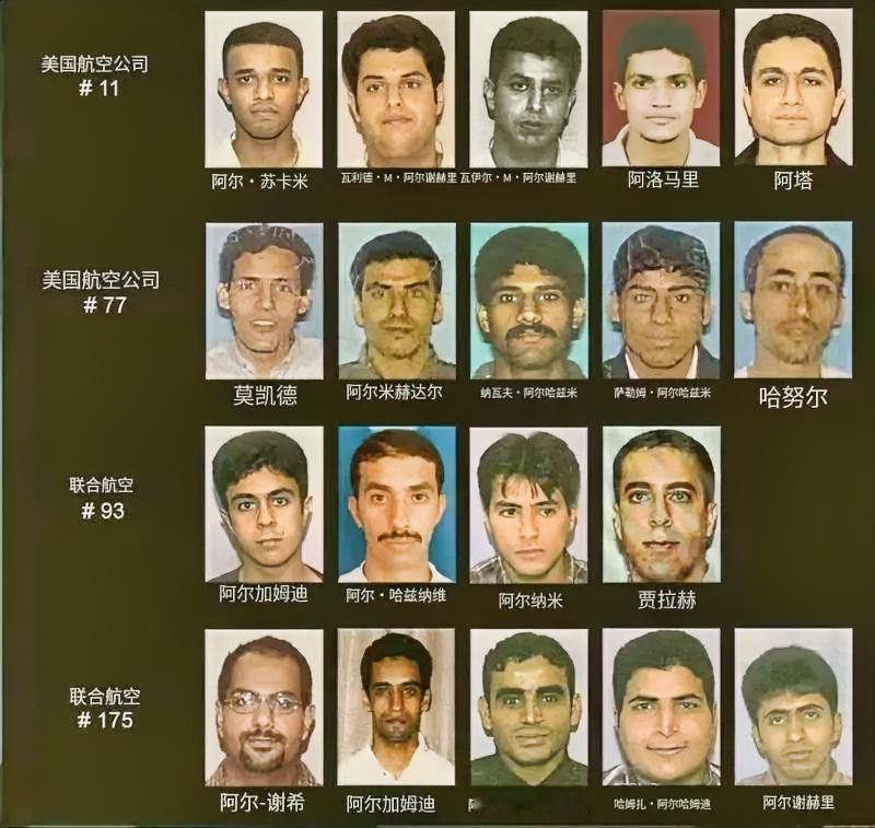 这是2001年美国“9·11”恐怖袭击事件中,19名劫机者的官方照片,他们分为四组,分别劫持了四架美国民航客机。 美国说这19人全部是基地组织成员,受本·拉登及核心策划者哈立德·谢赫·穆罕默德指挥。其中 15人来自沙特阿拉伯,2人来自阿联酋,1人来自埃及,1人来自黎巴嫩。 他们的年龄在20-33岁之间,平均年龄约25岁,大多出身中产阶级,部分人还接受过高等教育,甚至有航空工程、土木工程等专业背景,并非外界刻板印象中的“底层暴徒”。在行动前,他们分批潜入了美国,在飞行学校接受训练,为避免引起怀疑还进行了分散居住。 美国航空11号班机撞向了世贸中心北塔,埃及人穆罕默德·阿塔是整个袭击行动的总头目,也是这架飞机的飞行员。他曾在德国汉堡科技大学留学,是“汉堡小组”的核心,负责统筹整个计划。 沙特人阿卜杜勒·阿齐兹·奥马里是阿塔的副手,负责协助控制驾驶舱。 瓦利德·阿尔·谢赫里、瓦伊勒·阿尔·谢赫里兄弟2人负责胁迫乘客和机组人员。 萨塔姆·苏卡米负责控制飞机后部。 这架飞机于8:46撞入世贸中心北塔,是当天第一架被劫持并撞击目标的客机。 美国航空77号班机撞向了五角大楼,沙特人哈尼·汉朱尔拥有正式飞行员执照,负责驾驶飞机撞击五角大楼。他曾在美国多家飞行学校学习,对波音757的操作较为熟悉。 马吉德·穆克德、纳瓦夫·阿尔·哈兹米、萨利姆·阿尔·哈兹米、哈立德·米哈德尔4人负责控制飞机和乘客。 这架飞机于9:37撞入五角大楼西翼,造成125人死亡。 联合航空93号班机因乘客反抗,坠毁于宾夕法尼亚州。 黎巴嫩人齐亚德·贾拉负责驾驶飞机,原定目标可能是白宫或国会山。他也在德国学习过航空工程,与阿塔同为“汉堡小组”成员。 艾哈迈德·阿尔·哈兹纳维、艾哈迈德·阿尔·纳米、赛义德·阿尔·加姆迪3人负责控制飞机。 由于乘客得知其他航班的遭遇后奋起反抗,劫机者最终在9:03将飞机坠毁在宾夕法尼亚州的田野,机上44人全部遇难。 联合航空175号班机撞向了世贸中心南塔,阿联酋人马万·阿尔·谢希负责驾驶飞机,他也是“汉堡小组”的成员,与阿塔关系密切。 赛义德·阿尔·加姆迪、哈姆扎·阿尔·加姆迪、艾哈迈德·阿尔·哈兹纳维、法耶兹·阿尔·谢赫里4人负责控制飞机。 这架飞机于9:03撞入世贸中心南塔,是当天第二架撞击双子塔的客机。 这19人的行动直接导致近3000人死亡,数千亿美元的经济损失,并彻底改变了全球航空安全、反恐政策和地缘政治格局。美国随后以此为借口发动了阿富汗战争,并在全球范围内展开了长达几十年的反恐行动。