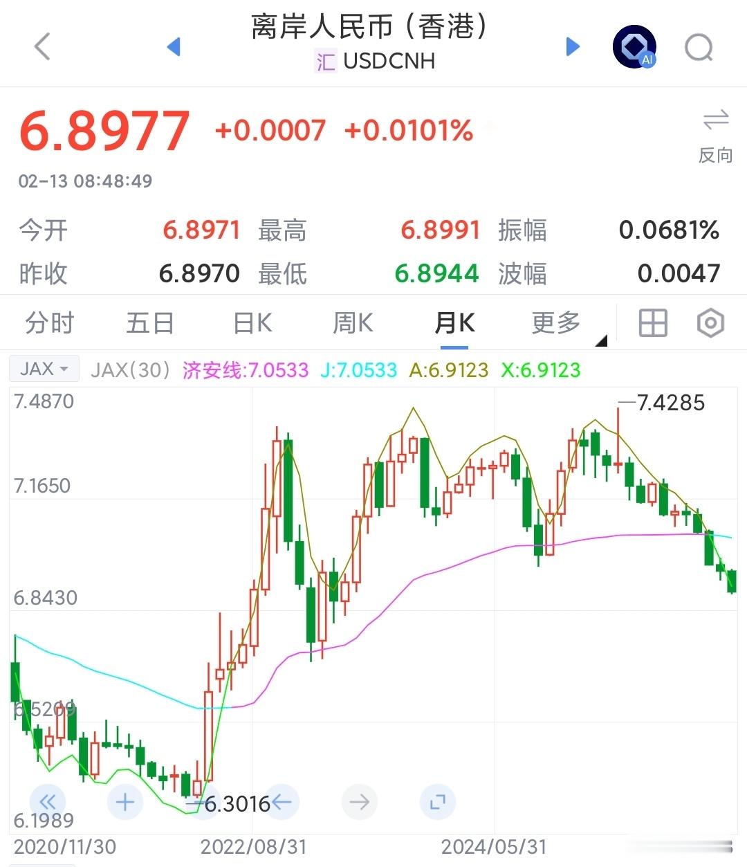 但是涨了14个月,其实也没多少,算7.35涨到6.9,只有6.5%!每个月也就0.5%,3分钱的样子。图中肉眼可见是个缓慢的升值节奏,之前升值快一些。
