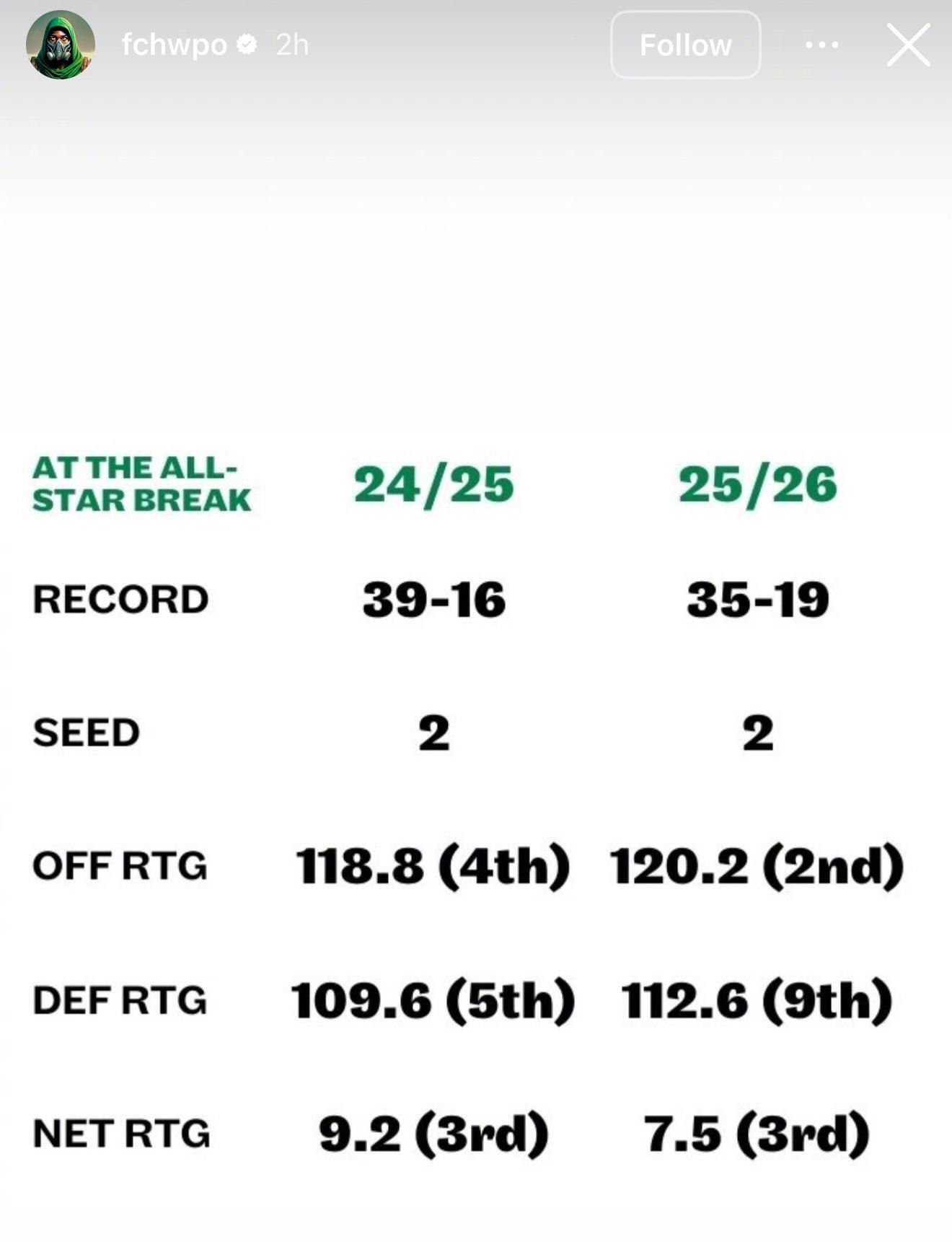 杰伦-布朗晒出了球队本赛季和上赛季全明星前的球队各项统计对比,谁会想到本赛季绿军表现依旧如此亮眼?