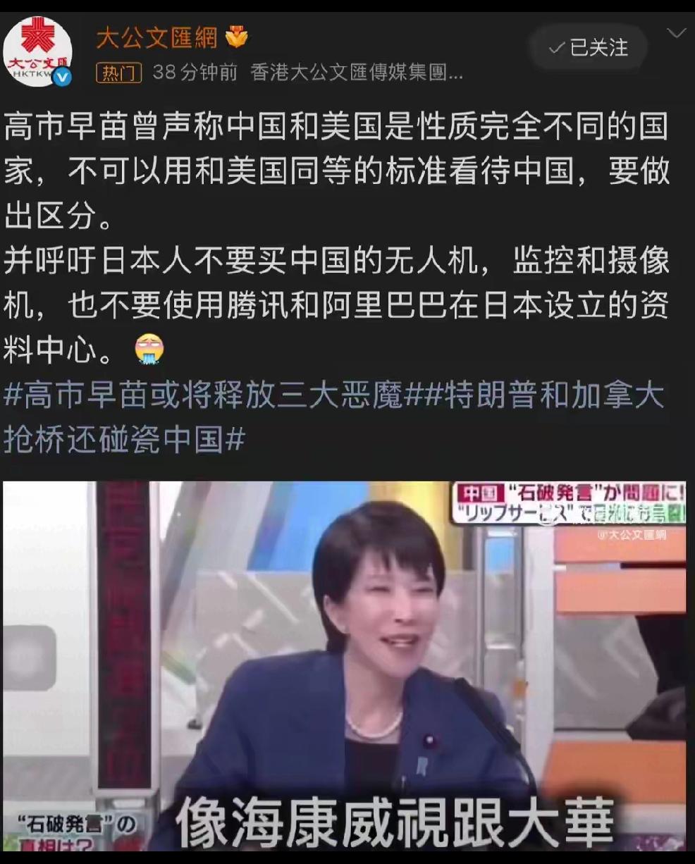 高氏早苗,口出狂言 2月12日,大公报报道,高市早苗在参加一档电视节目中表示:“中国与美国是两个性质不同的国家,不可以用和美国同等的标准看待中国。她呼吁日本人不要购买中国无人机,不要用阿里巴巴与腾讯设立在日本的资料中心。” 个人认为:果然是胸无点墨,只会喊口号耍怪态的日本政客,居然不要脸到这种程度了,日本人惧怕中国科技已经到了丧失理智,毫无原则,没有头脑的程度。 这般无脑并头脑发热的老年女人领导着一群无脑的中青年粉丝,做着白日梦,必然会在不久的将来,迎来注定会头破血流的南墙。
