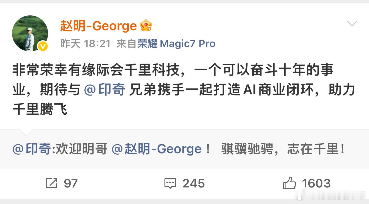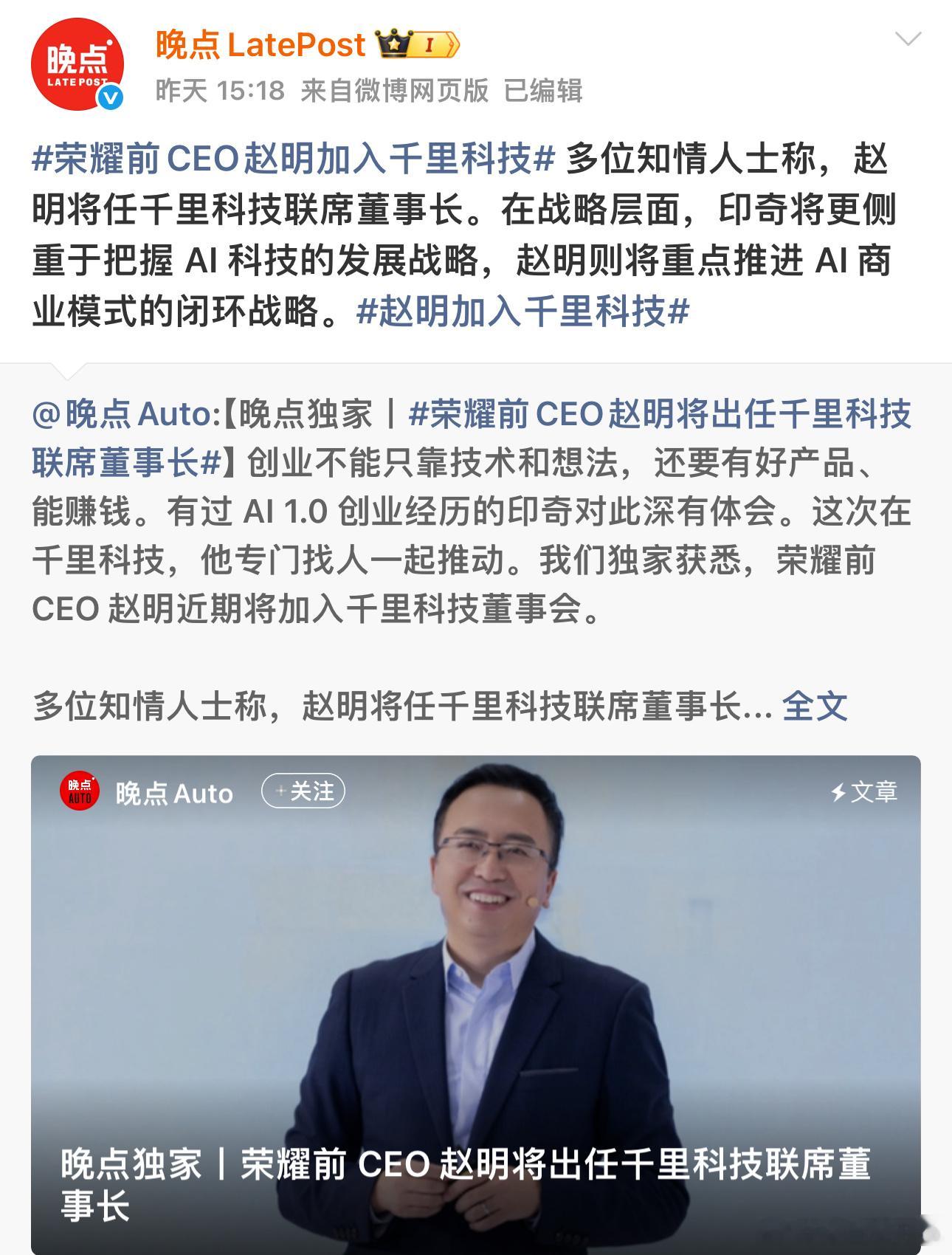 月初的时候还问过豆包,如果赵明加入千里科技,有可能会担任什么职位,当时猜可能和王军平级,毕竟这只是坊间的传闻,现在来看是联席董事长?