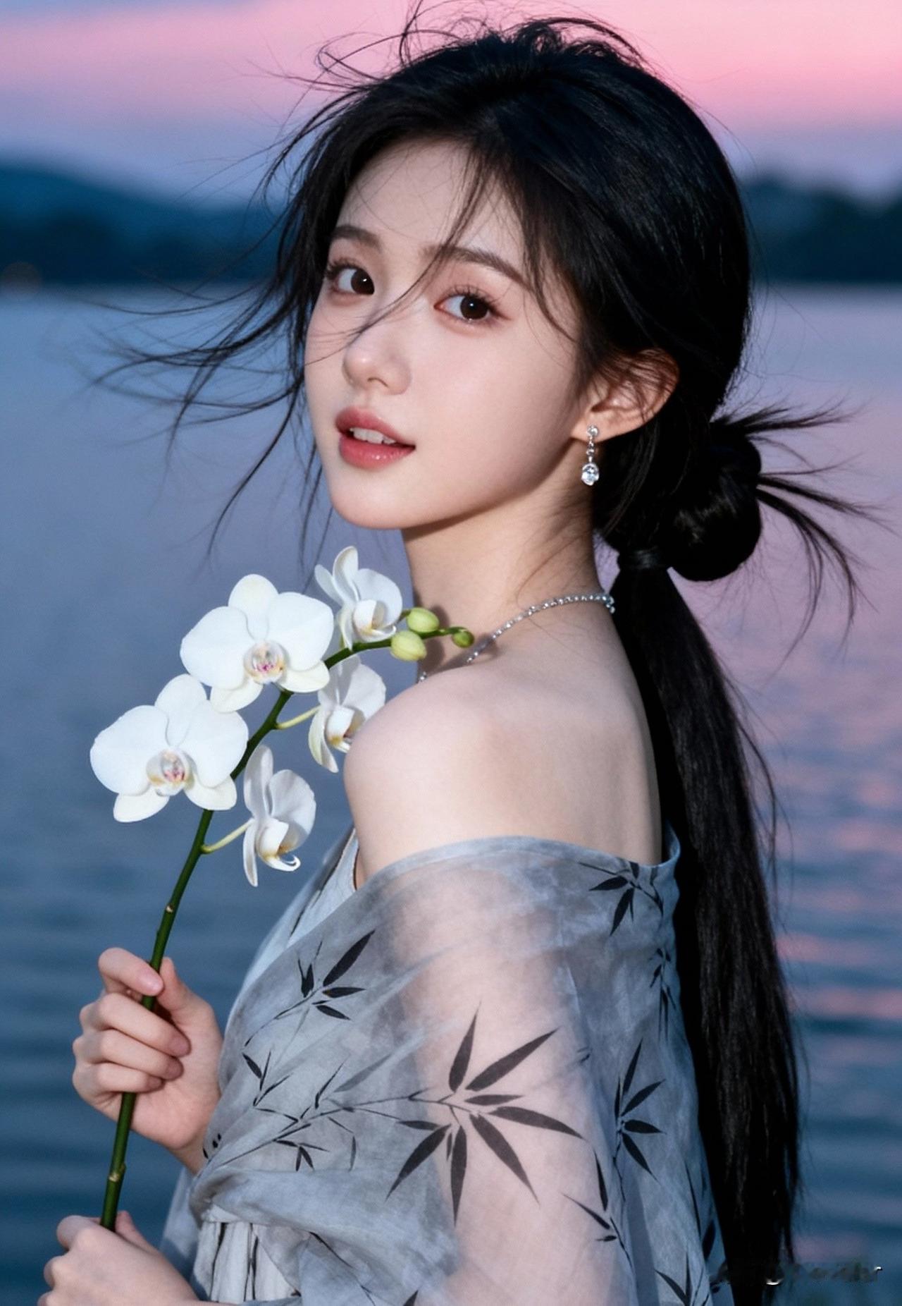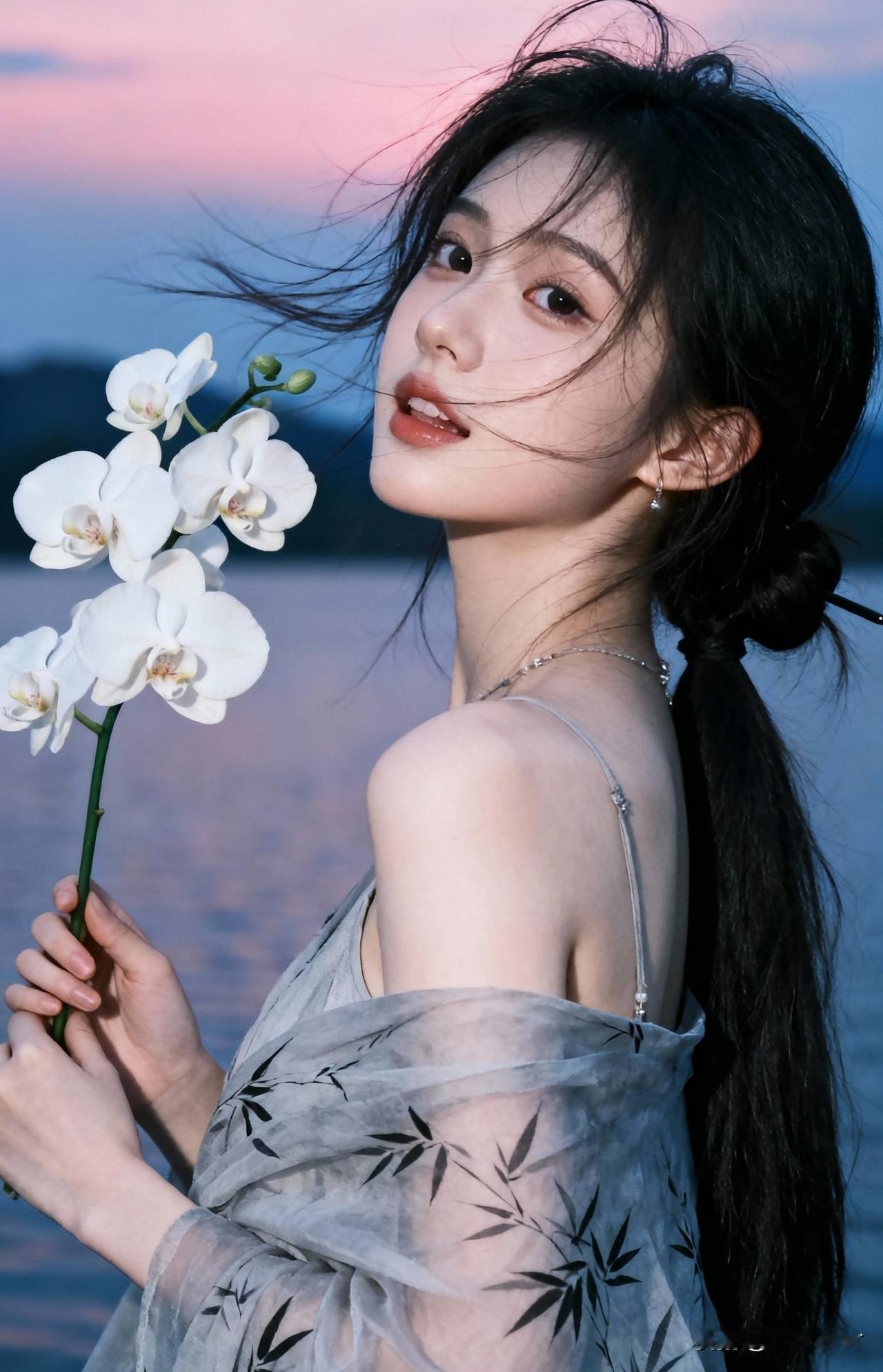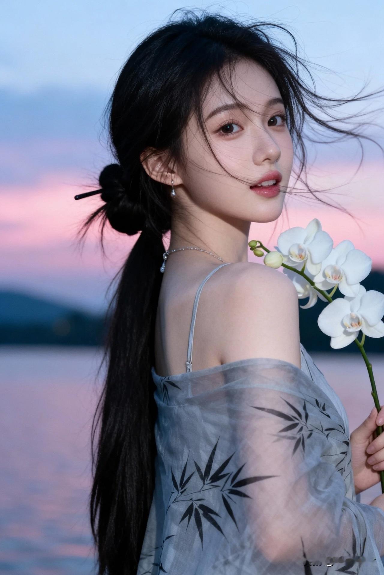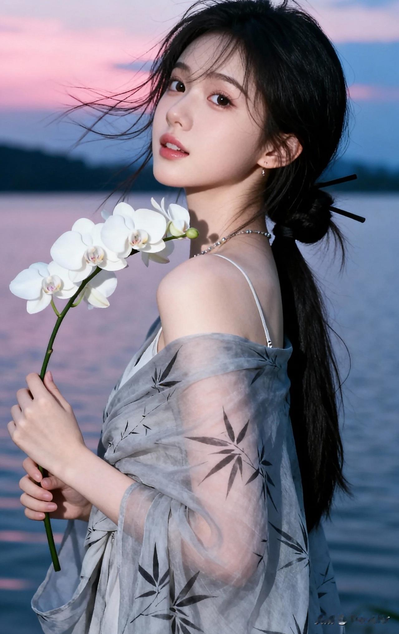 落日余晖下的少女,手持白兰,温柔动人。