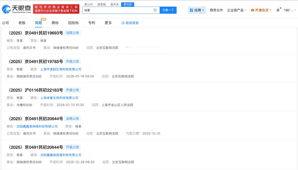 杨幂杨幂近期多次告黑杨幂多次发起维权诉讼2月12日,杨幂方发布本月维权进展,显示新增取证60件侵权案件,引发热议。天眼查法律诉讼信息显示,近期,杨幂已多次发起网络侵权责任纠纷、肖像权纠纷诉讼,被告涉及多个自然人及公司。其中李某、沈阳鑫鑫昊网络科技有限公司被法院公告送达民事判决书。此外,上海卓春生物科技有限公司、上海芊美韵生物科技有限公司被杨幂起诉侵权案件,分别于2026年1月19日、2026年1月13日开庭。杨幂方首次披露AI声音侵权胜诉细节