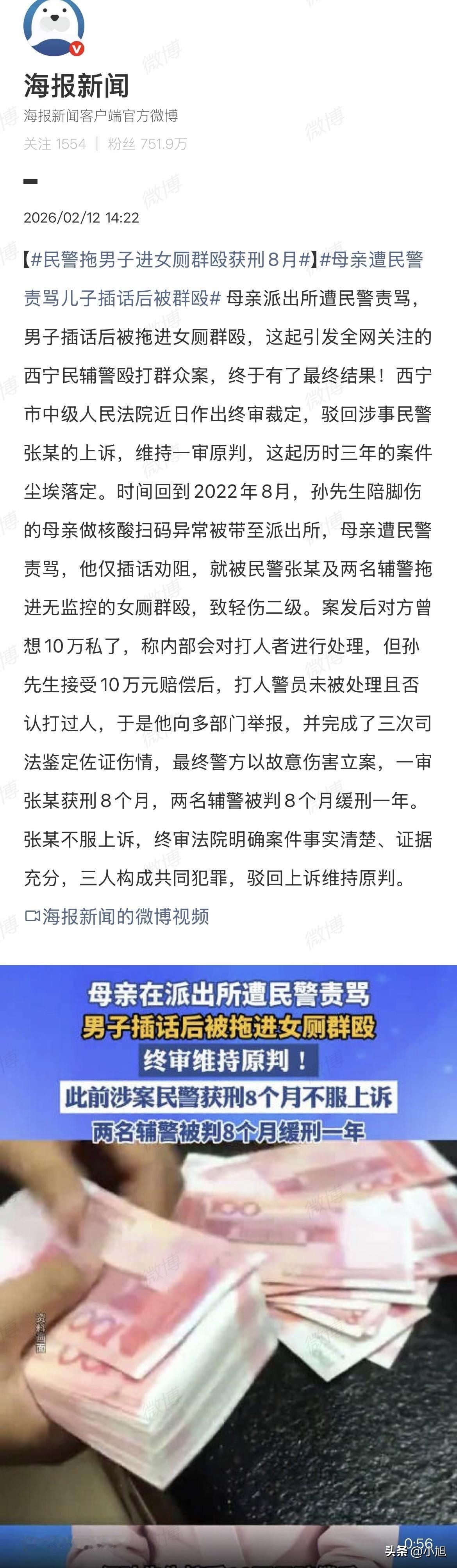 2022年8月29号那天早上,孙先生母亲脚伤刚好,下楼做核酸,扫码异常,社区报了警。母子俩进了彭家寨派出所,老人跟民警张某解释情况,话没说完,张某劈头盖脸骂过去。 六十二三岁的老太太,大清早被人指着鼻子骂。 当儿子的站在旁边,能怎么办?他要是顶嘴,那叫妨碍公务。他没顶嘴,就劝自己妈一句。四个字,声音大点都怕冒犯谁。 张某还是觉得被冒犯了。手一挥,一个辅警跟过来,两人把孙先生从屋里架出去。拖过走廊,推进女厕所。过一会儿,另一个辅警也进来。 门关上,派出所一楼那个女厕,位置偏,没监控,保洁阿姨不是每时每刻都在。那天早上,那里头就他们四个。 孙先生后来形容那个过程,用的词是“群殴”。不是推搡,不是制服,是拳打脚踢。三个人围着一个。 有人踢他后背。有人打他头。他蹲下去蜷起来,脚还往身上招呼。 多久?不知道。后来他记得疼,肩膀像裂开。 出来之后他先看母亲。老人还在外头等着,不知道厕所里发生了什么。他也没说。 当天去医院,拍片子,诊断写:右侧第6、7肋骨骨折,头部外伤,神经症状。 这个诊断,后来成了他最难跨的一道坎。 派出所那边很快来人,态度出奇好。私了吧,赔10万。你孙先生不是开店的嘛,店租免三个月。打人的我们内部会处理。 2022年秋天,10万块到账。孙先生以为这事结了。 过了几个月,他没见谁被处理。去问,对方说没打人。三个都这么说。你打人了,你没处理,你还说自己没打。 那10万块从赔偿金变成了封口费。 很多人到这一步就认了。钱收了,人没处理,再闹就是你不知好歹。 孙先生没认。他把收钱的记录留着当证据,开始往上一级一级告。公安、检察院、纪委、信访,能递材料的都递了。 最难的是伤情鉴定。第一次、第二次,鉴定结论都模糊。肋骨骨折,说不清是新伤旧伤。对方律师咬住不放:你凭什么说这是我们打的? 他不认,申请重做。第三次,青海省司法鉴定中心出的结论,推翻了一部分初诊—— 右侧第6、7肋骨骨折,那是陈旧伤,跟这次没关系。但右侧肩胛骨骨折,是新的。轻伤二级。头部神经症状、面部挫伤,轻微伤。 这个鉴定,把案子钉死了。三个被告到案的方式很特别,2024年6月,都是“电话通知到案”。 电话打过去,人来了。来了之后,一开始都说没打。审着审着,一个开口了,第二个也开口了,第三个慢慢也承认了。不是全盘托出,是挤牙膏,你问一点,他吐一点。 这个过程,卷宗里写得很细。三个人事先没商量过,没串供,进了厕所你一拳我一脚,打完了各走各的。 但在法庭上,这叫“共同犯罪”。一审开了两次庭。2025年1月14号第一次,7月16号第二次。 2025年11月12号上午,宣判。 民警张某,故意伤害罪,有期徒刑八个月,当场拘捕。 两名辅警,同罪,八个月缓刑一年。附带民事赔偿那部分,经法院调解,三人再赔孙先生188966元。 之前那10万是私了的,不算数了。 张某当庭喊上诉。他的辩护律师在法庭上说:鉴定委托主体不当,依据不足,伤情可能是别的原因造成的。 法官问:什么别的原因?律师没答上来。 2026年1月12号,西宁中院公开开庭二审。 法官问得细。问张某:你承不承认打了人。 张某说:我承认有肢体接触,但不是故意伤害。 法官又问:你把人从询问室拖出来,拖二十多米,推进女厕所,你一个男的,为什么不拖去男厕?张某不说话了。 2月12号,终审裁定下来,驳回上诉,维持原判。 三年八个月。孙先生拿到裁定那天,记者问他什么感受。 他说:看着张某被法警控制带走,心里五味杂陈。 他没笑,没如释重负,没慷慨激昂。 三个穿警服的打一个老百姓,最后判了八个月。他用了三年半,花掉的时间精力,不是那18.8万能填平的。 但有一个细节值得细想。法院在终审裁定里专门写了一段话,关于孙先生有没有过错。 张某上诉时说,孙先生不配合工作,有重大过错。 法院查完说:孙先生的行为对本案引发具有一定过错,但他没有实施辱骂或使用过激言语激化矛盾的行为,故不具有重大过错。 这句话什么意思。 意思是,他说“妈别说了”这四字,在有些人眼里,已经算是过错了。 你挨打,是因为你让你妈别说了。 你挨打,是因为你没闭嘴。 你挨打,是因为你站在那儿。 三年八个月之后,法律终于认了:那不是过错。 案子判完,孙先生的代理律师石健伟说了一句话。 他说这个案子,本质是执法权和公民自由权的问题。不管什么人,穿什么衣服,在什么场合,不能打着执法的旗号,侵害普通人的合法权益。 一个男人,陪脚伤刚好的母亲做核酸,母亲被骂,他劝一句,被拖进女厕所打。打完,对方拿钱想平事。平不了,就翻脸不认。 你遇到过类似的事吗?如果你在现场,会开口劝母亲别说了,还是选择沉默?