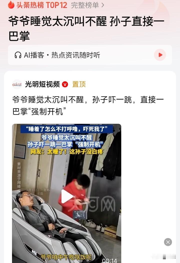 这孙子不错,孙子叫爷爷吃饭,爷爷在按摩椅上睡的很深沉。孙子看见爷爷叫不醒,也不打呼噜,心里面咯噔一下,一巴掌打爷爷脸上。爷爷才缓慢的站起来,这孙子才舒缓一口气说,吓死我了。 看到这我相信很多人都会有这样的担心,看上孙子给爷爷一巴掌,其实是对爷爷色爱。我相信这爷孙两个人的感情肯定很深。 希望他们能健健康康的!