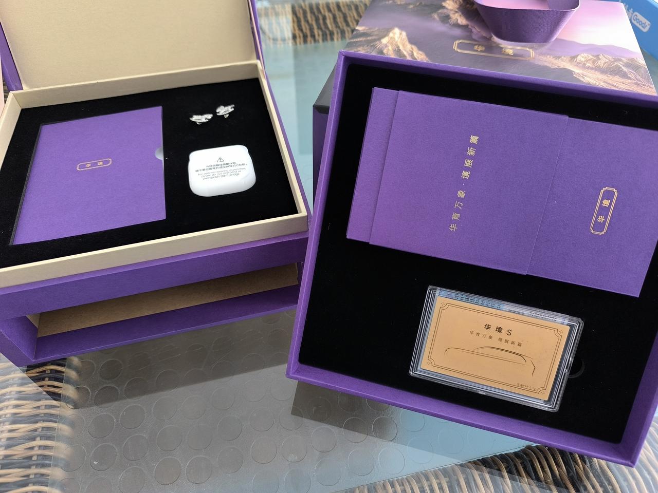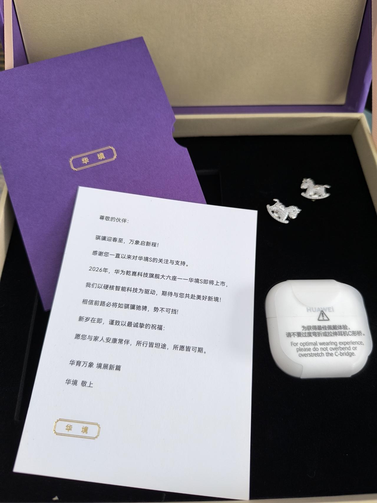 感谢华境汽车送来的新年礼物!一对精致的小马胸针、华为无线耳机,还有一张足金小金卡