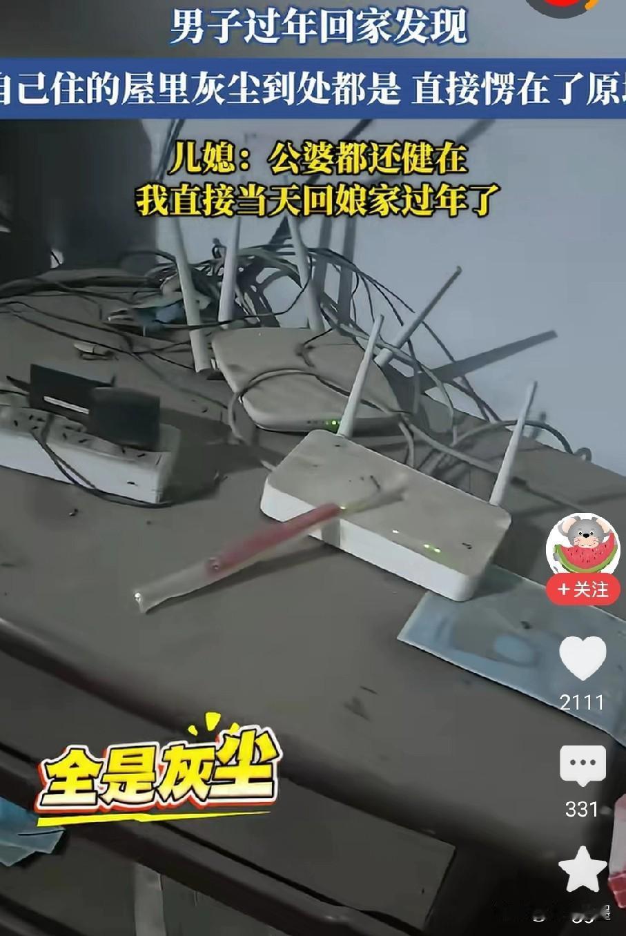 男子带媳妇回老家过年,结果一进去发现,自己住的那间屋子乱七八糟,家具布满灰尘,俨然一副很久没打扫过的样子! 媳妇看到这一幕后非常生气,扭头就回了娘家,她认为公婆都健在为什么不给打扫一下呢,明显是不欢迎他们回来过年! 从这间房子的灰尘厚度来看,明显是很久没人住了,说明男子一年到头都不大回来住,甚至几年都没回来住了! 不回来住,也就意味着不大回来看望父母,不回来有可能是在很远的外地打工,也有可能觉得混的不好愧对父母,也有可能是与父母有矛盾! 既然回到了这个家,有手有脚,房子可以自己打扫一下,趁着过年把一些不愉快的事解决一下,年后开开心心去上班,岂不美哉!
