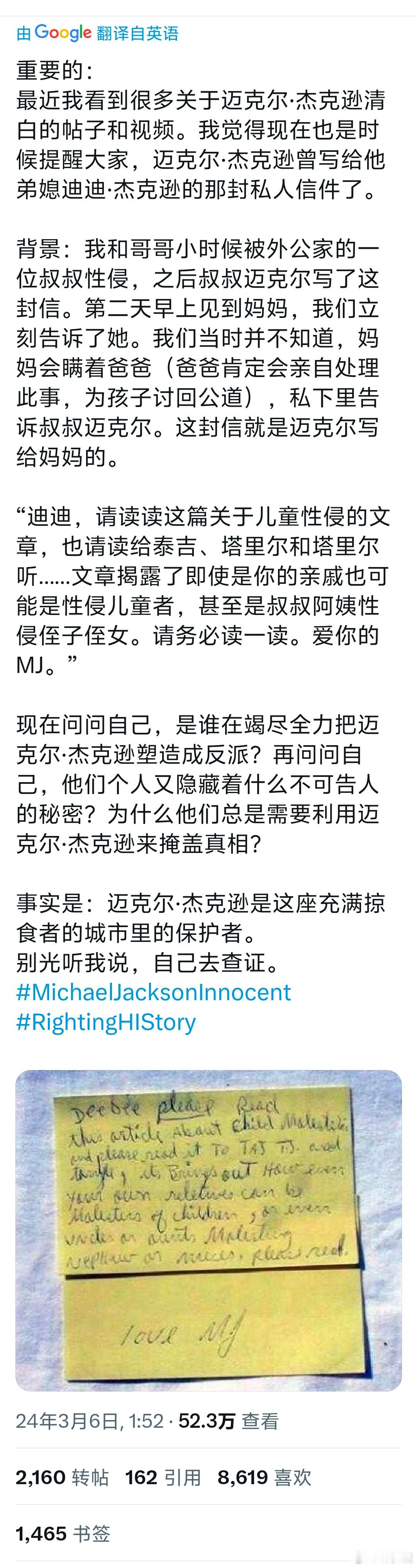 迈克尔杰克逊知道后,给侄子们写下了图3这段话。