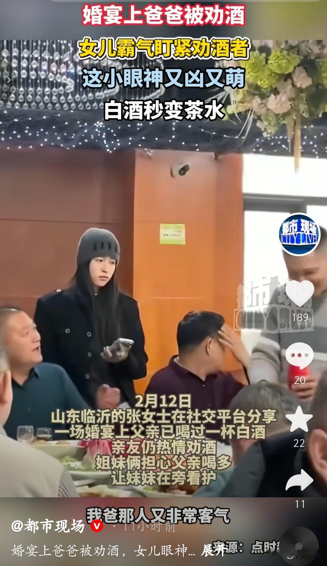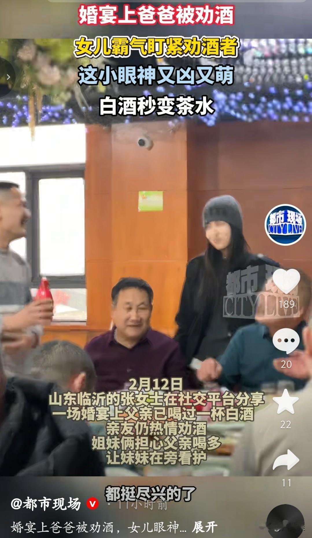 版本一(贴合要求,大白话风格) 这位小姐姐干了我一直想干的事!2月12日山东临沂的一场婚宴上,张女士的父亲已经喝了一杯白酒,亲友们还在热情劝酒。担心父亲喝多,姐妹俩安排妹妹守在旁边,全程霸气盯着劝酒的人,那小眼神又凶又萌,最后还悄悄把白酒换成了茶水,既护住了父亲,又没扫大家的兴。 看到这一幕,我瞬间共情了。每年春节,我爸也是这样,本身就好客,经不住亲友劝酒。不管我怎么提前叮嘱,他都抹不开面子,次次喝到不省人事。被扶回家后,他吐得一塌糊涂,躺在床上连话都说不出来,看着就让人心疼。