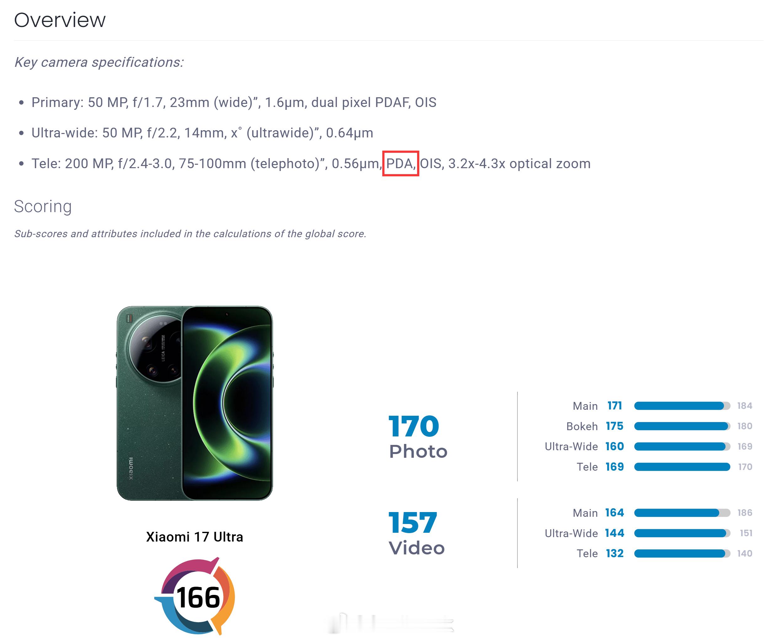 小米17 Ultra 的DxoMark成绩出来了,拍照170视频157,总分166,排行第六名,不得不说,Dxo能不能检查下官网的错别字