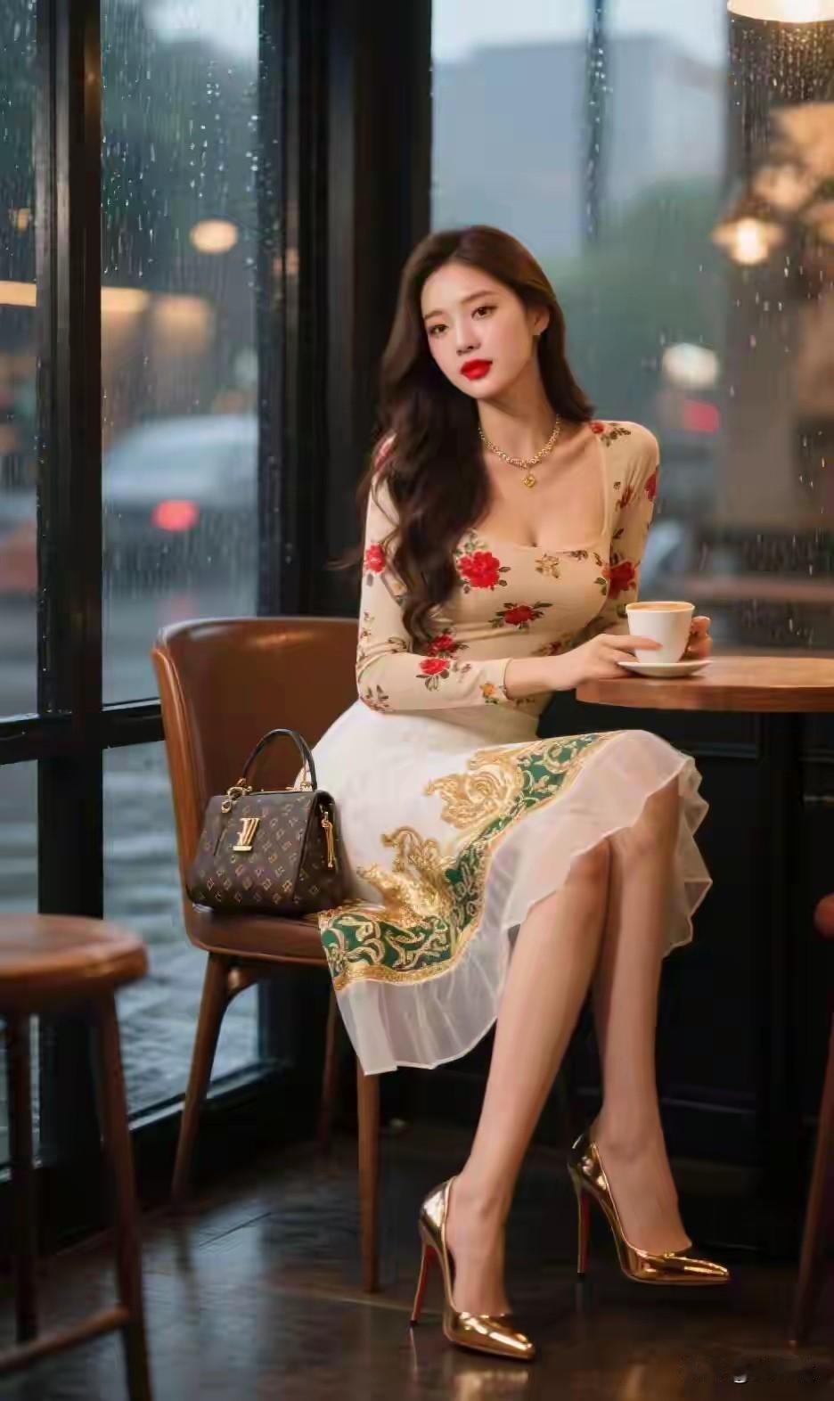 印花裙子雅韵生, 手捧咖啡沾风情。