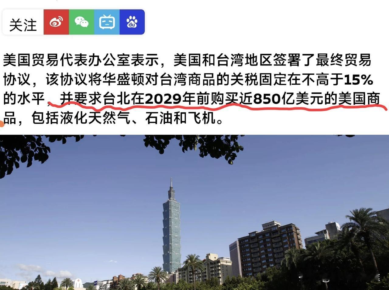 美国与台湾签下了最终贸易协议:降低台湾关税为 15% ,台湾向美国投资 5000 亿美元,还需要再购买美国 850 亿美元商品 对美国商品降低关税 甚至为“零“! 美国贸易代表办公室 申明 美国与台湾地区已经签署完毕了最终贸易协议。除了在此前美国商务部宣布将台湾关税降为 15% 及 5000 亿对美投资之外,还额外再增加了台湾必须购买美国的商品 ,时间截止到 2029 年前,台湾必须采购美国 850 亿美元的商品,包括: 444 亿美元天然气 石油, 152 亿美元民用飞机 发动机 ,及 252 亿美元的电网设备 发电机 材料 存储设备 及海洋设备 钢铁等 另外:台方将同意美制小客车及汽车零组件自协议生效日起降至零关税,美国输入保健食品关税也会从百分之三十降至百分之十,美国农产品也有可能开放市场与降税! 这就是台当局为了迎合美国给予的 15% 关税而付出如此之大的代价,这完全可以认为是“被洗劫一空”!这台湾的汽车产业 农产品及工业制品将而对美国商品的冲击,台湾老百姓接下来的产业面临着什么样的困境,这是可想而知的。 另外美国所需要的台积电逐步外迁到美国包括台积电的供应链一并进入美国,也将影响到台湾民众的就业 及产业的衰败。但美国的压力已经让台当局只能听众美国的摆布了! 除了商品及产业投资之外,美国还有一笔一笔巨额的军售订单,要让台当局更吞下去,111 亿美元刚出台,接下来据说还有 200 亿美元对台军售,而台当局军售预售为 400 亿美元,这更是进一步掏空台湾的卖台行为。 美国如此“血洗”台湾来形容 美国的恶毒,同时谴责民进党倚外谋“独”,在所谓台美贸易谈判中无原则媚外,无底线卖台。民进党就是败家子,台湾的罪人!