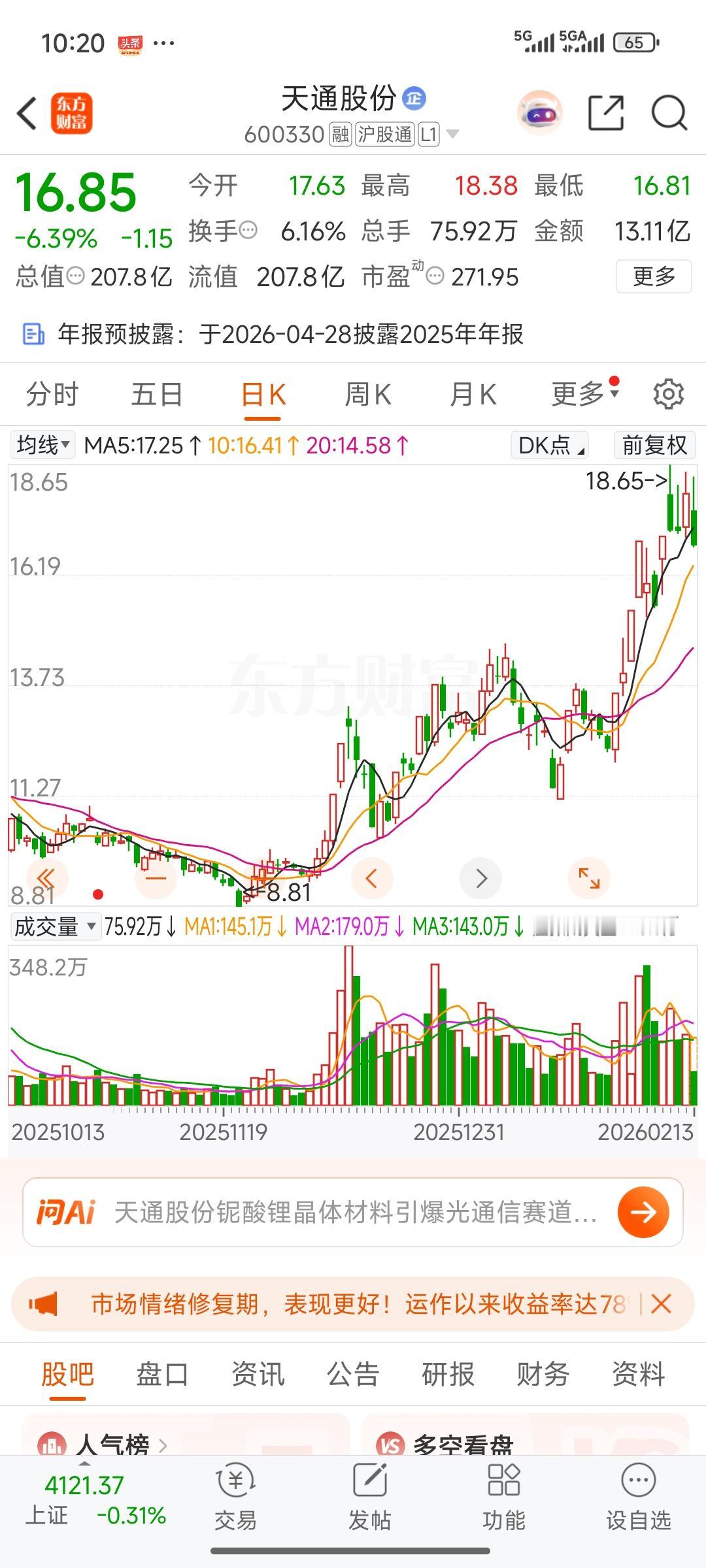 哎呀,惨了!今天天通股份跟随大盘略微低开,随后迅速拉高,紧接着便扭头向下,目前已大跌6%。实际上,在今天之前它已连收三根阴线,颇有三只乌鸦压顶之势,情况着实不妙。难道短期高点已然显现?天通股份的行情就此结束了吗?主力要毫不留情地出货了吗?真没想到,它有这么多概念,股价却连20都还没到! 目前,它只是触碰了5天均线。按照今天的形势,股价可能会调整至20天线,再次回到20天线不无可能。看来又要打持久战了,短期冲高的可能性十分渺茫,只能准备和它继续耗下去了。 地天板股票 天普股份龙虎榜 航空天板块 天普股份 天特股份 天沃股份 天通卫星通讯