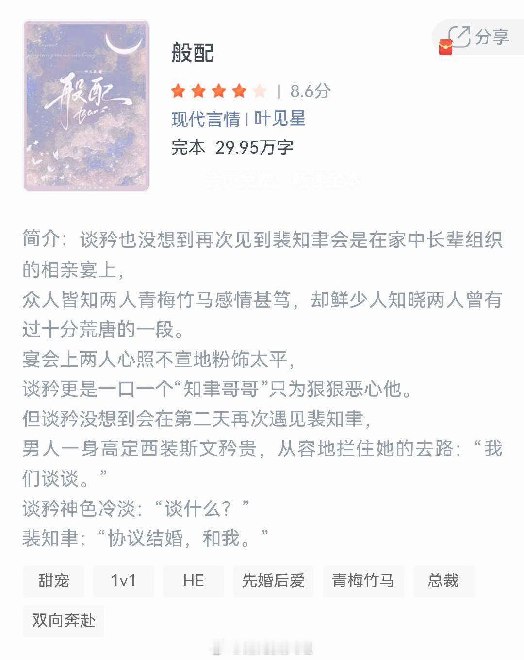《》作者:叶见星谈矜也没想到再次见到裴知聿会是在家中长辈组织的相亲宴上,众人皆知两人青梅竹马感情甚笃,却鲜少人知晓两人曾有过十分荒唐的一段。宴会上两人心照不宣地粉饰太平,谈矜更是一口一个"知聿哥哥"只为狠狠恶心他。但谈矜没想到会在第二天再次遇见裴知聿,男人一身高定西装斯文矜贵,从容地拦住她的去路:“我们谈谈。”谈矜神色冷淡:“谈什么?”裴知聿:“协议结婚,和我。”兜兜转转还是这些小说好看 这小说真的超绝