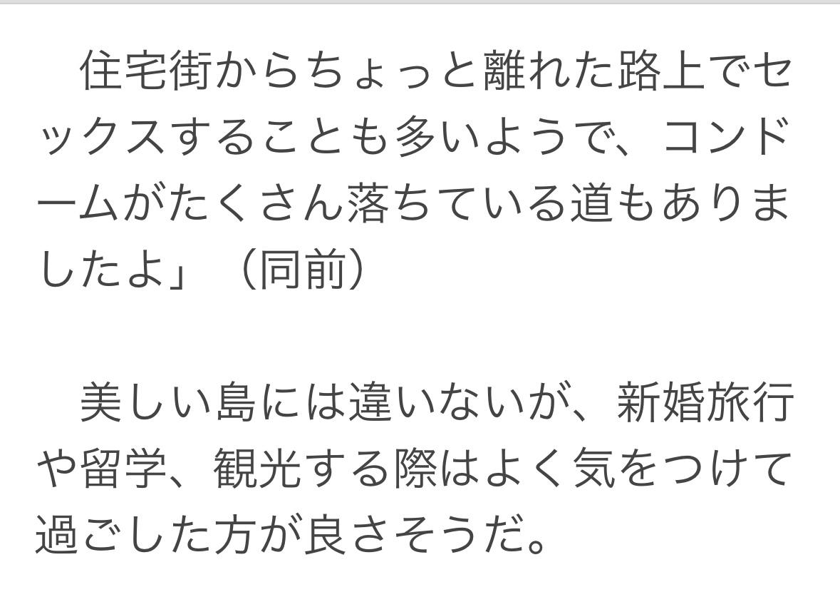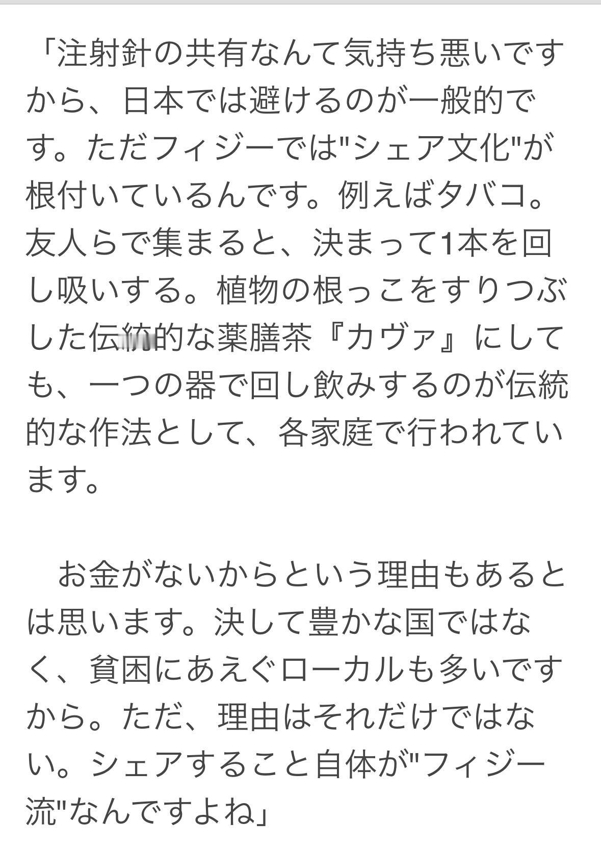 斐济重复使用注射器,吸毒时共用针头,艾滋病毒感染超过3000人。 斐济分享文化根深蒂固,朋友聚会时总是共用一支香烟。就连卡瓦酒传统上也是每户人家共用一个杯子,许多当地人生活在贫困之中。 斐济年轻一代性行为极端放纵,针对日本和中国女性的恶作剧尤其过分。有人亲眼目睹一个身材魁梧的男人突然从背后摸遍一个女人的全身,脸上还带着笑容。亚洲女性通常肤色白皙身材娇小,斐济男人常常用性化的眼光看待她们。性行为似乎经常发生在远离居民区的街头,路边到处都是用过的避孕套。