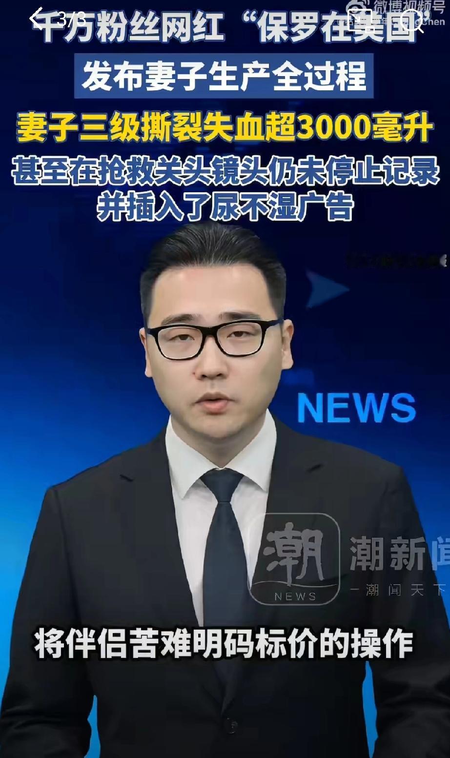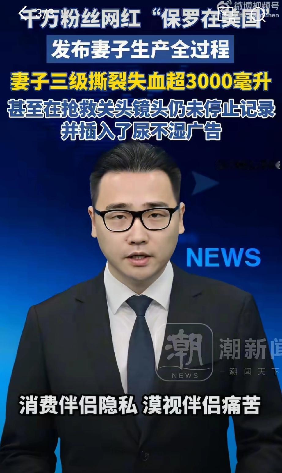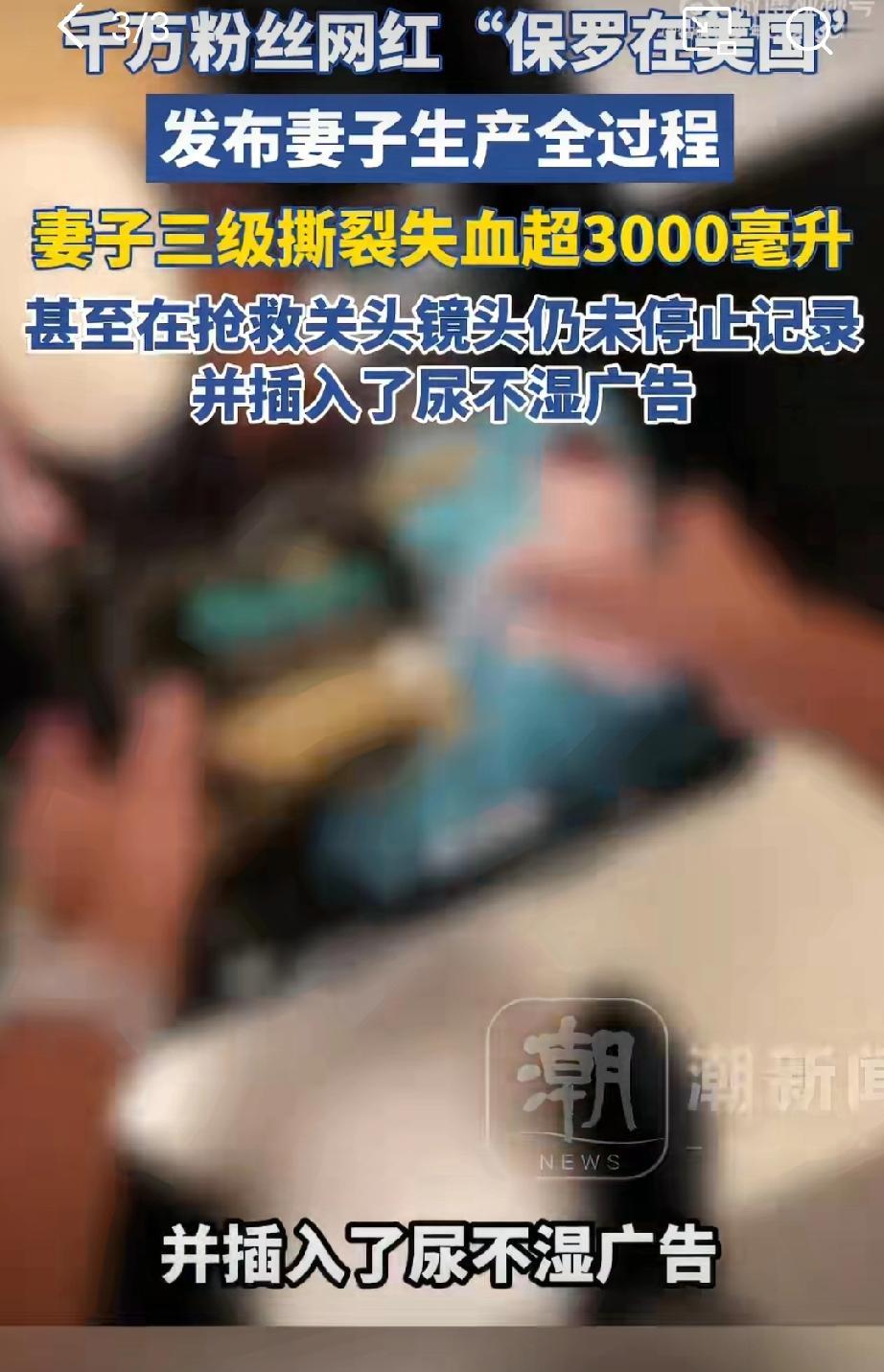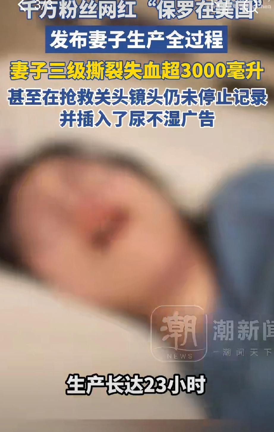 千万粉丝博主“保罗在美国”发布妻子分娩全程视频为什么会引起那么大的反感?核心原因有三点,其中最关键的是,这场惊心动魄的难产本可以完全避免。 首先是不合时宜的商业炒作:妻子正在抢救这种危急时刻,视频中竟插入尿不湿广告口播;还有产后仅6天,还处于三级撕裂感染风险期的妻子,就被安排参与“妊娠纹”相关商业拍摄,完全忽视了产妇的身体恢复与心理状态。 而最值得质疑的是,这场难产本可规避。要知道,若在国内,胎儿已超40周、体重7斤多,再加上母体本身瘦小,这种情况在产前评估时,大概率会建议剖腹产;即便尝试顺产,医生也会建议侧切,以此避免难产,这是最基础的生产常识。 可最终,这场本可避免的生产,生生酿成了一场灾难:妻子遭遇三级会阴撕裂(阴道至肛门肌肉损伤,发生率仅0.5%-10%),还出现大出血3344毫升,该出血量占成人总血量的67%-84%,属于极高危产科事件。结合两人详尽的商家广告计划,让人不禁质疑:你们难道就没有做过细致的产前评估?没有制定最优的生产及应急方案?没想过怎么尽全力保障母婴安全? 所以大众的反感我是能理解的,本质上是对两人把这次分娩当成了洽取利益的机遇,却漠视了母子的生命健康、消费了产妇痛苦却满足了商业的炒作。同时,这场本可避免的高危分娩背后,其实也体现了平台的流量分配制度出现了问题,保罗的产房镜头,照出了所有自媒体人的流量焦虑,这也是我们值得警惕的。 美国怀孕日记 在其美生孩子