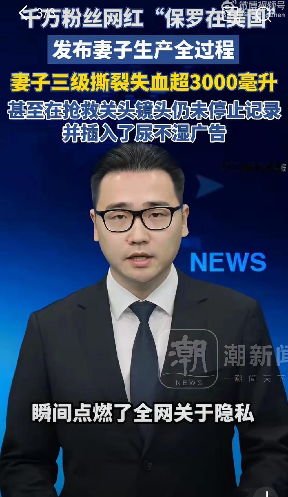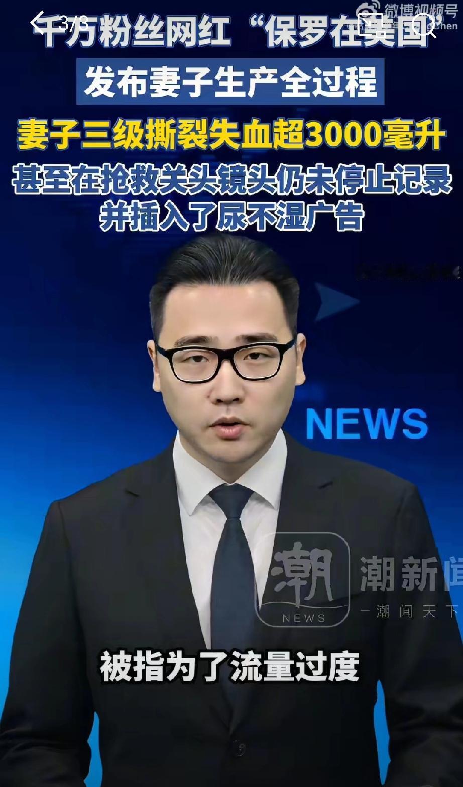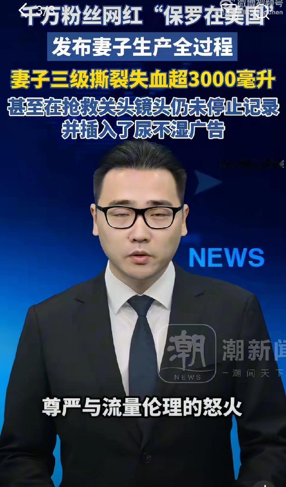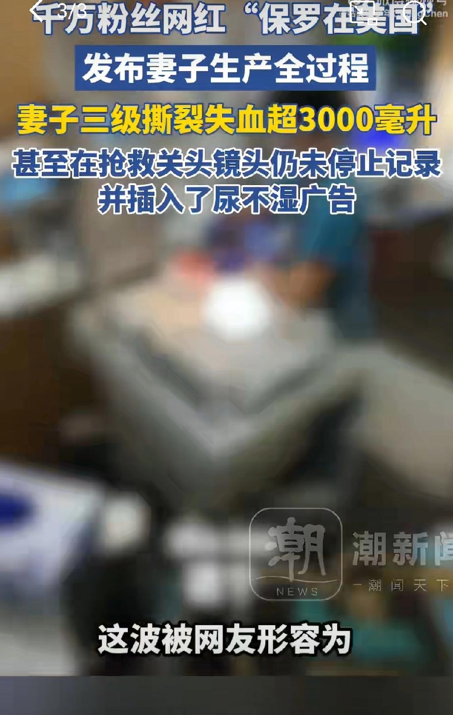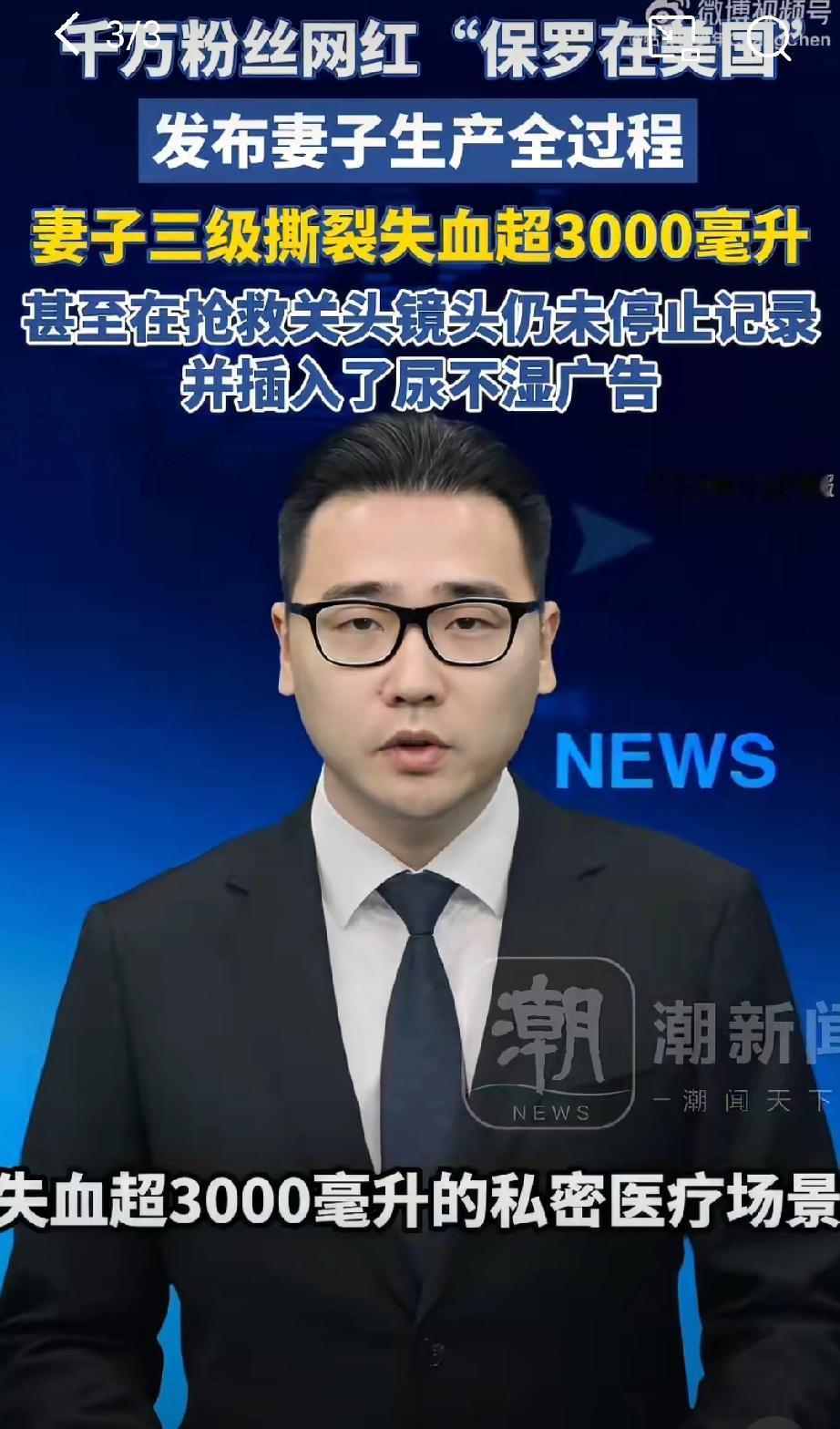 千万粉丝博主“保罗在美国”发布妻子分娩全程视频为什么会引起那么大的反感?核心原因有三点,其中最关键的是,这场惊心动魄的难产本可以完全避免。 首先是不合时宜的商业炒作:妻子正在抢救这种危急时刻,视频中竟插入尿不湿广告口播;还有产后仅6天,还处于三级撕裂感染风险期的妻子,就被安排参与“妊娠纹”相关商业拍摄,完全忽视了产妇的身体恢复与心理状态。 而最值得质疑的是,这场难产本可规避。要知道,若在国内,胎儿已超40周、体重7斤多,再加上母体本身瘦小,这种情况在产前评估时,大概率会建议剖腹产;即便尝试顺产,医生也会建议侧切,以此避免难产,这是最基础的生产常识。 可最终,这场本可避免的生产,生生酿成了一场灾难:妻子遭遇三级会阴撕裂(阴道至肛门肌肉损伤,发生率仅0.5%-10%),还出现大出血3344毫升,该出血量占成人总血量的67%-84%,属于极高危产科事件。结合两人详尽的商家广告计划,让人不禁质疑:你们难道就没有做过细致的产前评估?没有制定最优的生产及应急方案?没想过怎么尽全力保障母婴安全? 所以大众的反感我是能理解的,本质上是对两人把这次分娩当成了洽取利益的机遇,却漠视了母子的生命健康、消费了产妇痛苦却满足了商业的炒作。同时,这场本可避免的高危分娩背后,其实也体现了平台的流量分配制度出现了问题,保罗的产房镜头,照出了所有自媒体人的流量焦虑,这也是我们值得警惕的。 美国怀孕日记 在其美生孩子