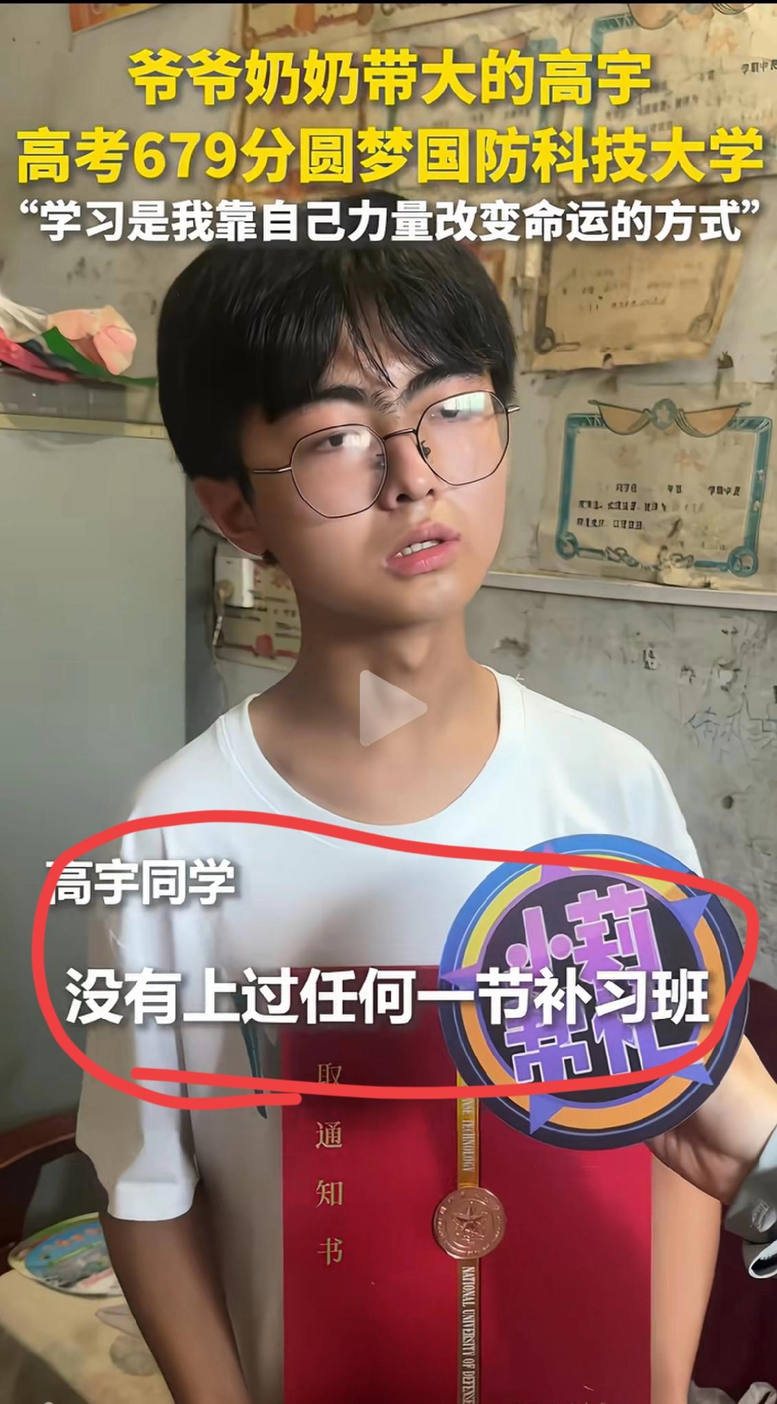 这位以679分考上国防科技大学的平民学子说他从小没有上过一节补习班,看到他那颗硕大的脑袋网友们深信不疑。 这位高宇同学介绍自己从小在爷爷奶奶身边长大,一直是爷爷奶奶用种地来供他上学。70多岁的爷爷此时是如此的骄傲,尽管辛苦老人却略带愧疚的表示“只是让孩子吃饱了饭,别的都是靠他自己。” 对此高宇同学却展现出远超年龄的认知,他从小就明白尽管自己需求不多但已经是这个家庭最大的开支,于此同时他也是这个家庭最大的期待。所以这么多年他都清楚,他需要把自己所擅长的事件努力到极致。 贫困的生活没有磨灭高宇同学对于未来的热情,反而激发了他熊熊热焰。清贫的家庭却充满了爱的关怀,爱一个孩子从来不是去溺爱,而是让他有一双敢于飞翔的翅膀。 这个故事不但告诉了我们“穷人的孩子早当家”,这句话的意义。还有就是高考的确给予了无数困难重重人生凤凰涅槃的机会。 一个社会最大的危机其实是阶级固化,而高考筛选机制让人才打破阶层流动起来。尽管可能有一些不完美,但现在的确是最公平的筛选机制。 加油高宇同学,你有一个光明的人生。