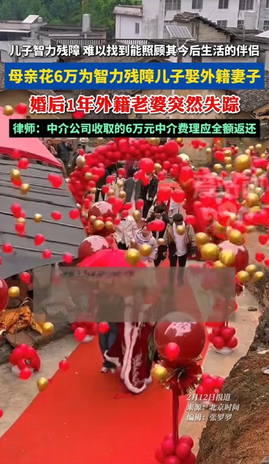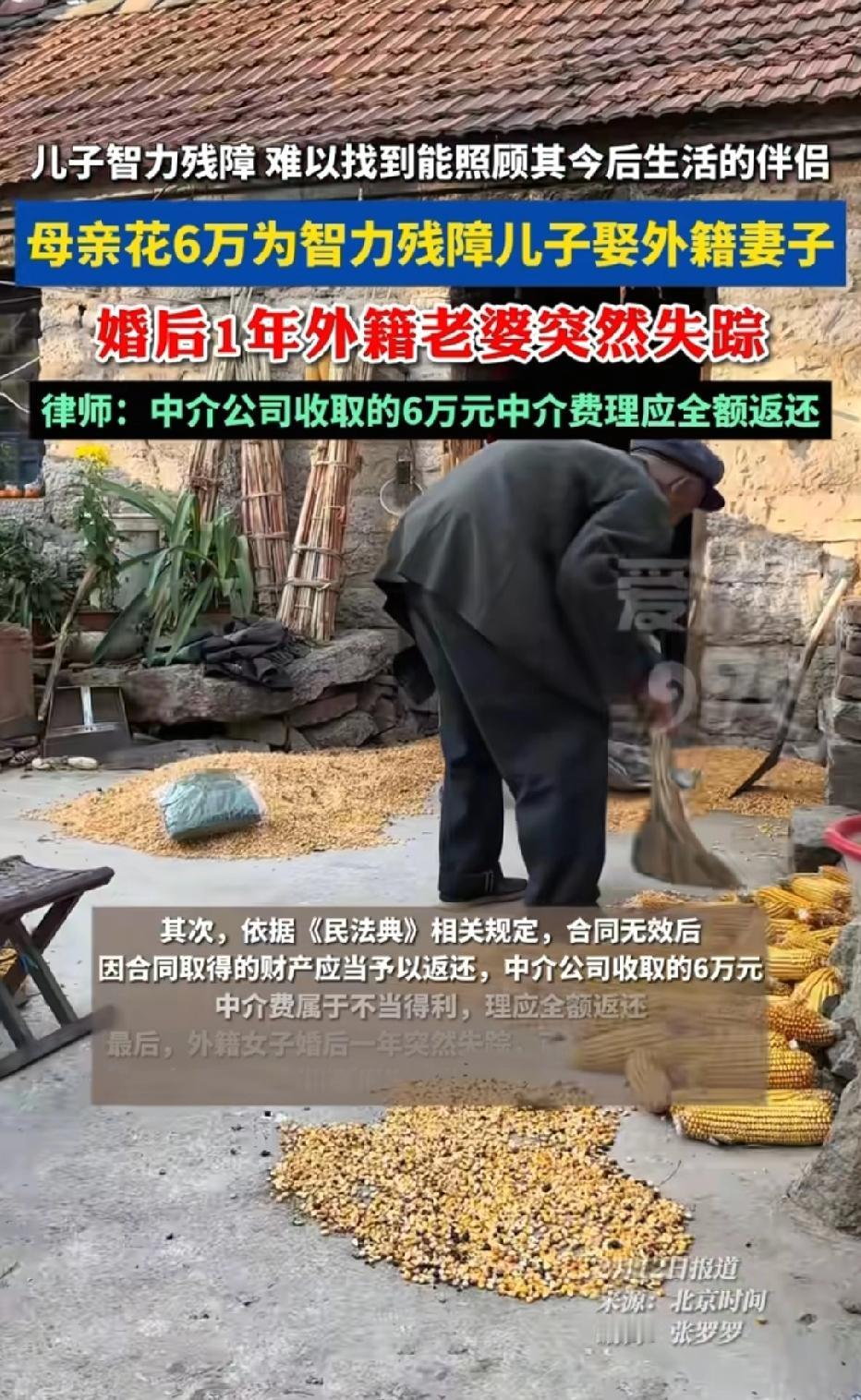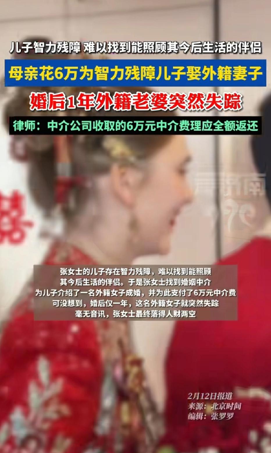 太荒唐!一母亲担心智力残障的儿子,无人照顾,她在某婚介花6万元,想给儿子找个对象,婚介介绍了一个外籍女子,不料,婚后一年,女子突然失踪,男子的母亲落得人财两空,气得向婚介讨要6万元中介费。 张女士发现儿媳妇不见了,到处找也找不到,她心里有些慌。 房间里人去屋空,行李、随身物品悉数带走,没有留下只言片语,手机也始终处于关机状态。 不祥的预感瞬间笼罩了这个家庭,她最担心的事还是发生了。 自己倾尽积蓄为智力残障儿子寻来的伴侣,终究还是跑了。 一年的期盼与付出化为泡影,6万元中介费打了水漂,落得人财两空的结局,让张女士悲愤交加,只能一次次找婚介所讨要说法。 张女士的儿子因智力残障,生活自理能力有限,多年来一直未能找到合适的结婚对象。 她看着儿子孤身一人,张女士整日忧心忡忡,生怕自己百年之后,儿子无人照料、无依无靠。 为了给儿子找个靠谱伴侣,让他后半生有个依靠,张女士四处打听,最终找到了一家承诺“包介绍成功”的婚介所。 面对婚介所开出的6万元高额中介费,张女士虽心疼不已,但为了儿子的未来,还是咬牙凑齐费用,与婚介所签订了服务协议。 婚介所很快兑现承诺,为张女士的儿子介绍了一名外籍女子。女子看似温顺懂事,相处融洽,不久后两人便办理了结婚登记。 看着儿子组建了小家庭,张女士悬着的心终于放下,以为从此能安享晚年。 可这份安稳仅仅维持了一年,外籍儿媳毫无征兆地突然失踪,彻底打碎了这个家庭的希望。 儿媳失联后,张女士多次联系婚介所,对方却百般推诿,既不帮忙寻找,也拒绝退还6万元中介费。 看着智力残障的儿子茫然无措的样子,想到自己的血汗钱付诸东流,张女士既委屈又愤怒,于是在网上咨询,这个中介费是不是可以全部退? 此事一经曝光,迅速引发网友热议,大家纷纷为张女士的遭遇感到惋惜,同时对违规婚介所的行为表示谴责。 有网友感慨,母爱太伟大了,可惜遇上了黑心婚介,6万血汗钱就这么被骗了,太让人心疼! 有网友直言,“跨国婚介本来就不靠谱,专门坑弱势群体,这种婚介所必须严查,退还中介费还要赔偿!” 有网友表示,“智力残障人士的婚姻本就该谨慎,婚介所只认钱不审核,根本没尽到责任,太缺德了!” 花钱买婚姻本身就有风险,希望老人能拿回钱,也提醒大家别轻信涉外婚介的骗局! 《国务院办公厅关于加强涉外婚姻介绍管理的通知》明确规定,任何个人和单位不得采取欺骗手段或以营利为目的,从事或变相从事涉外婚姻介绍活动。 本案中,婚介所以6万元费用为智力残障男子介绍外籍女子,属于典型的违规涉外婚介,违背法律禁止性规定。 同时,《民法典》第153条规定,违背公序良俗、违反法律强制性规定的民事法律行为无效。 因此张女士与婚介所签订的中介服务合同自始无效。合同无效,中介费应全额返还。 《民法典》第157条规定,民事法律行为无效、被撤销后,行为人因该行为取得的财产,应当予以返还。 婚介所基于无效合同收取的6万元中介费,属于不当得利,必须全额退还给张女士。 即便婚介所辩称“已提供介绍服务”,也因服务内容违法,无权主张收取费用。 若婚介所明知外籍女子身份信息存疑,仍虚构事实、隐瞒真相收取费用。 婚介所涉嫌欺诈,需承担相应责任。 若外籍女子与婚介所串通,以结婚为幌子骗取财物, 《刑法》第266条,双方还可能涉嫌诈骗罪,6万元已达到“数额巨大”标准,需承担刑事责任。 婚姻不是交易,更不能用金钱买卖。涉外婚介不仅违反法律规定,还暗藏身份造假、骗婚跑路等多重风险,尤其是弱势群体家庭,切勿轻信“包成功”“高价找外籍伴侣”的承诺。 选择婚介服务时,务必核实机构资质,签订正规合同,避免落入消费陷阱。 目前,张女士已准备通过法律诉讼维权,相信法律会给她一个公正的结果,让违规婚介所承担应有的责任。 对此,你怎么看?