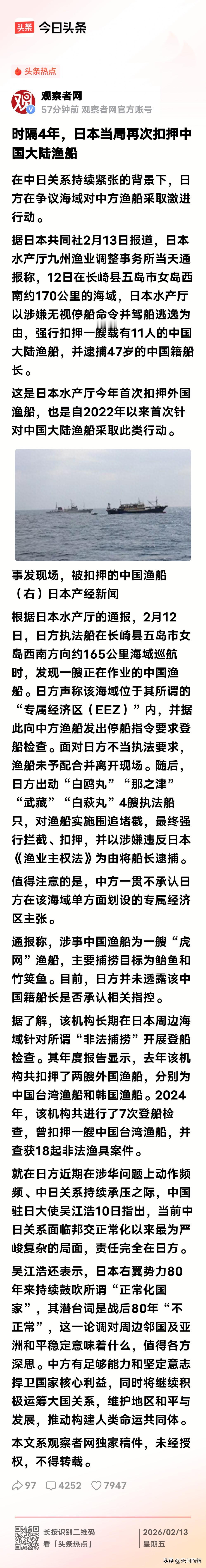 日本扣押了一艘中国渔船,47岁的船长被捕,在目前这种情况下,日本为什么要采取这种行动?看来这是故意寻衅滋事,以此来表明它们强硬的态度,但是这么做的后果也是很显然的,因为我们不可能就这样听之任之,接下来肯定会有相应的措施!