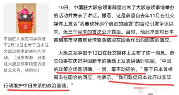 日本媒体注意到了!薛剑大使在对高市早苗言论发出“砍掉那个肮脏的脑袋”后,首次参加公开活动!2月12日,日媒报道称,10日,中国驻大阪总领事薛剑出席了大阪总领事馆举办的活动并发表了讲话。日媒表示据悉,这是薛剑大使自去年11月在社交媒体上发表“砍掉那个肮脏的脑袋”的言论以来,近三个月来的首次公开露面。 而在预祝中国新年的活动上,薛剑大使发表讲话称,中国的政策立场是明确、一贯、毫不动摇的。鉴于日本首相高市在国会的回应,我们敦促日本政府以实际行动维护中日关系的政治基础。 很显然,为什么薛大使的公开露面引起日媒的关注,这恐怕有两方面原因。 第一个核心原因,就是此前那句表态引发的后续影响太大。要知道,这句话一出,日本自民党就曾闹着要将薛剑总领事列为“不受欢迎人物”,甚至要求驱逐出境,一时间双方的舆论交锋十分激烈。 而在那之后,薛剑总领事就极少出现在公开场合,就连今年1月大阪当地民间团体举办的新春活动,他也缺席了,这就给日媒留下了很大的想象空间,大家都在猜测他的处境,以及中方是否会因为此事调整对日本的外交姿态,所以这次他一露面,自然就成了日媒关注的焦点,恨不得从他的一言一行中找出“蛛丝马迹”。 第二个原因,就是当前中日关系的特殊性,以及薛剑总领事自身的身份分量。薛剑总领事作为中国驻大阪的总领事,直接对接日本关西地区的各界交流,他的公开表态,某种程度上就代表着中方在关西地区的外交立场,甚至能从侧面反映出中日关系的走向。 就在薛剑总领事露面的同时,有消息称中日两国外长将在慕尼黑安全会议上同框,这是日本众议院改选后,两国高层的首次潜在接触,日方对此抱有很高的期待,希望能借此机会与中方沟通,缓解双方的紧张关系。 在这个节点上,薛剑总领事的公开讲话,自然被日媒解读为中方对中日沟通的“态度信号”,大家都想知道,中方到底会不会松口,会不会给日方想要的“沟通机会”,这也是他们紧盯此次活动的重要原因。 其实大家仔细品味薛剑总领事此次的讲话,就能明白中方的立场从来没有变过。他强调“中国的政策立场是明确、一贯、毫不动摇的”,这句话看似简单,实则传递出两个关键信息:一是中方在核心利益问题上,比如台湾问题、历史认知问题上,绝不会让步。 二是中方始终愿意维护中日关系,但前提是日本政府要拿出实际行动,而不是嘴上喊着“沟通”,背地里继续发表不当言论、干涉中国内政。 中日关系的政治基础,是双方达成的四个政治文件,而台湾问题,就是这条基础线上不可触碰的红线,高市早苗的言论,恰恰是踩在了这条红线上,这也是中方之所以强硬回应的根本原因。 可能有朋友会觉得,中方的表态是不是太强硬了?其实不然,外交场上的表态,从来都是基于国家利益的,你敬我一尺,我敬你一丈。 日本方面如果真的想推动中日关系重回正轨,就应该正视自身的错误,约束政客的不当言论,停止干涉中国内政,而不是一边挑衅中方,一边又期待中方主动缓和关系,这显然是不现实的。 薛剑总领事的此次公开露面,与其说是“打破沉默”,不如说是中方的一次“立场重申”——我们不惹事,但也不怕事,只要日方守住底线、拿出诚意,中日关系就能稳步发展,反之,中方也会坚定维护自身的合法权益。 说到底,日媒的过度关注,本质上还是源于中日关系的紧张态势,以及日方对中方立场的不确定。 他们既担心中方会持续强硬,影响双方的经贸、民间交流,又想从中方的表态中找到“缓和的机会”,这种矛盾的心理,让他们不得不紧盯薛剑总领事这样的关键人物。 但无论日媒怎么猜测,中方的立场都不会改变,我们敦促日本政府认清形势,摒弃错误做法,以实际行动维护中日关系的政治基础,这不仅是对中方的尊重,也是对日本自身利益的负责。 毕竟,中日两国一衣带水,和则两利,斗则俱伤,这是历史和现实都已经证明的道理。 信息来源:1. 《联合早报》2026年2月12日报道《松开日本官员的手,王毅将登机离国,中日或见上一面,薛剑再发声》 天南地北大拜年