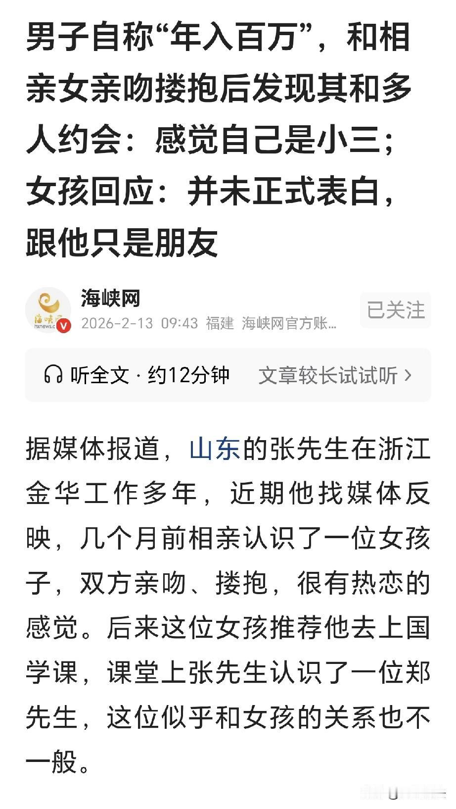 浙江金华,一男子37岁,为找对象,他在婚介所花了3万成为高级会员,婚介所给他介绍了一位女士,俩人3天拥抱,5天接吻,男子给她花了10000元,可万万没有想到,一个偶然机会,男子见到另一位男会员,俩人一捋时间,发现交往的是同一个女士,女子错开时间和他们约会,男子大怒,立刻找婚介所退费,女子语出惊人: 亲吻很正常,我没和他恋爱! 张先生急着脱单,他找到一家婚介所里,毫不犹豫的一掷千金,他就是希望,婚介所能给他找到心仪的对象。 可是现实给了他重重一击,他是相中了其中一位,可是这位女嘉宾给他狠狠的上了一课。 原来,张先生已经37岁,他事业有成, 在金华义乌做电商已经5年。 他忙着工作,每天全身心的投入,不知不觉,他就即将步入中年。 他此时此刻,已经有了危机,他看着周围人结婚生子,不由得自己也着急了起来。 朋友得知了他的想法,连忙给他推荐了一家婚介,可婚介所的服务费很贵,想要高档的私人定制会员,光是会费都要交15000元。 可婚介所表示,只要钱花到位,就能安排6个女嘉宾和他一对一见面。 如果张先生看不上,直接就给他介绍下一位。 张先生一听,这服务可以,他立刻交钱,婚介所笑逐颜开,马上就给他包装起来。 婚介所在推荐文中描述,说张先生事业有成,是企业老板,年入百万,妥妥的钻石王老五的形象。 婚介所还在介绍,张先生婚恋要求对方性格温和就好,其他就没有任何的要求。 张先生一看这文案,立刻就信心满满,他以为自己这样的条件,一定就会引起女嘉宾们的兴致。 谁知6个女嘉宾见完,却一个合适的都没有,张先生虽然很失望,但是对婚介所的服务还是相当的满意。 于是他又续了8999元会费,又见了好几位女嘉宾,依旧还是失望而归,婚介说看他还不满意,主管主动联系,要求他再升级服务。 这次升级只需再交5998元,张先生满怀希望再次支付了费用。 而这一次,让他大开了眼界,婚介所领来一位朱女士,打扮得体,容貌秀丽。 俩人见面,顿时来电,张先生暗自庆幸,果然是一分价钱一分货,只要钱到位,啥事都好办。 俩人看对了眼,认识了3天就牵手拥抱了。 张先生十分高兴,请女嘉宾吃顿饭都要花上1000多元。 相识5天,俩人忍不住亲吻了起来,自此以后,张先生就认为,俩人这是确立了关系。 谁知没过几天,张先生发现,朱女士突然态度就变了。 张先生去摘牙套,朱女士竟然全程都不高兴。 张先生怕她生气,也怕失去这段感情,可是朱女士却表示,她发现张先生的脾气性格都有问题。 于是她就推荐了一个国学的课程,学费6888元,张先生为了挽回朱女士,当场就交了费用。 之后俩人又好了一阵,张先生以为,他们会有美好的结局,并且在学习课程的过程中,朱女士给他介绍了另一位男士小郑认识。 谁知到了跨年夜的时候,张先生发现小郑和他一样,也是同一婚介所的私定会员。 两人惺惺相惜,立刻攀谈了起来,说起彼此的经历,俩人突然发现,都被蒙骗了。 原来,在圣诞节那天,张先生还和朱女士约会,他们甜甜蜜蜜,宛若一对热恋中的情侣,谁知第二天婚介所就把朱女士介绍给了小郑。 而跨年夜当天,朱女士温柔备至,给小郑按摩,还请他吃饭。 到了傍晚,朱女士说有事离开,他没有想到,朱女士又去找张先生过跨年夜。 张先生顿时气的火冒三丈,自己诚心实意是想跟朱女士交往婚恋,没想到却被对方骗的如此惨状。 他投入了金钱,投入了时间。投入了他的真心,没想到是这样一个结果。 在张先生看来,婚介所既然已经将朱女士推荐给了自己,俩人已经确立了关系,为何还要再推荐给别人? 但朱女士却不这么认为,她说自己并没有和张先生确定恋爱关系,俩人只是朋友,拥抱亲吻非常正常,她并不认为这有什么。 因此朱女士认为,既然俩人还没有确定关系,她接触别人,又有什么关系? 张先生看她不认账了,直接找到婚介所理论,谁知婚介所表示,朱女士是普通会员,她只交了3000元会费。 只要她没有明确和张先生的关系,婚介所就可以继续给她推荐其他会员。 而婚介所只负责推荐,并安排会员见面,至于最后能不能成,这要看会员自己的发展,和婚介所没有关系。 张先生更生气了,自己花了3万多元,买的就是一对一的定制服务,婚介所收完钱就不认账,严重违背了当初的约定。 张先生要求退款,还要全额退款,这种服务他接受不了,可婚介所却说,已经按照合同要求给他推荐了女嘉宾,他们已经完成了任务,因此这钱退不了了。 最终经过协商,婚介所只退了他没参加的5999元活动费用。 张先生吸取了教训,对高价婚恋服务再也不抱什么希望了。 最终,还是同事帮他介绍了新的女友,因为知根知底,俩人相处非常的融洽。 奇妙的是,张先生和小郑反而成为了好朋友,真是不打不成交! 对此,你怎么看?