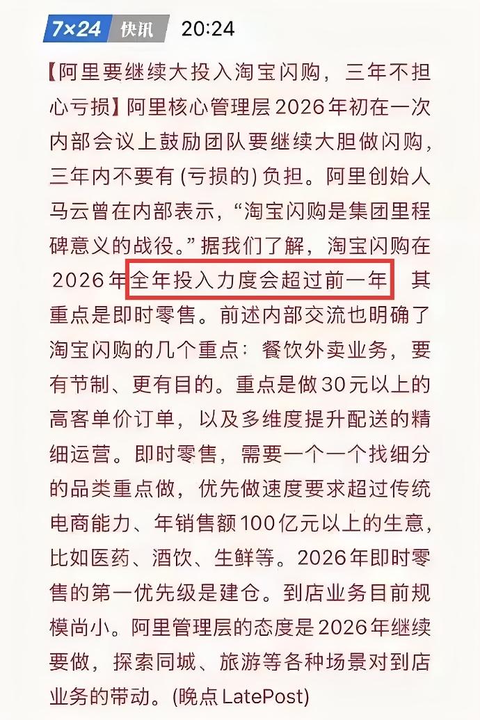 看来2026年阿里还是要死磕闪购,美团的日子怕是不好过了。现在下单外卖都是京东、美团、淘宝闪购三家对比,哪里便宜下单哪里,就这么简单。淘宝闪购虽然亏损很大,但是给淘宝引流也是很大的,还能抢占即时配送的市场份额,反正怎么样都不会亏。
