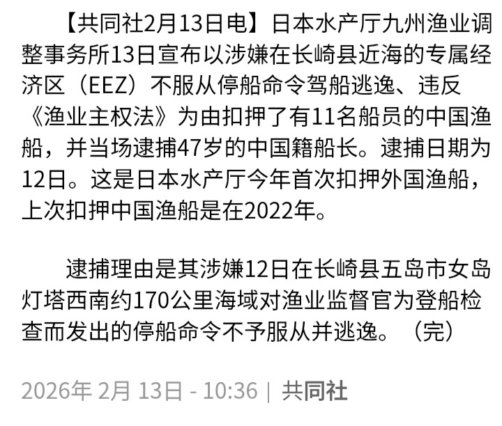 日本共同社:日本水产厅九州渔业调整事务所13日宣布以涉嫌在长崎县近海的专属经济区不服从停船命令驾船逃逸、违反《渔业主权法》为由扣押了有11名船员的中国渔船,并当场逮捕47岁的中国籍船长。逮捕日期为12日。这是日本水产厅今年首次扣押外国渔船,上次扣押中国渔船是在2022年。