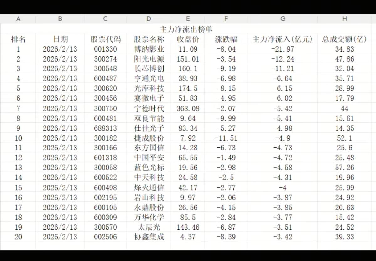 2.13周五 主力资金 抢筹出逃个股榜! 资金抢筹: 1.军工,航天,航母 2.空间站概念 3.消费电子 4.高宽带存储 5.农牧鱼饲 资金出逃:航运港口,钢铁行业,煤化工,能源金属,有色金属,钛白粉等资金大幅流出