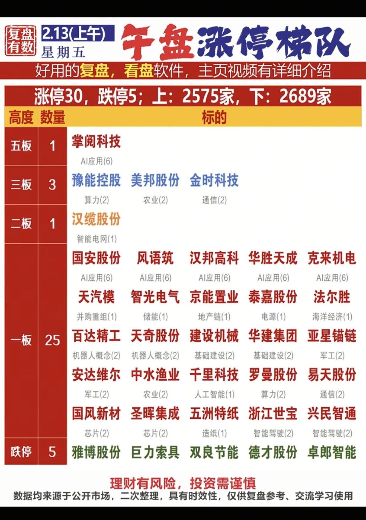 2.13周五 涨停板股票:复盘统计! 涨停板30家,跌停5家 涨跌比2575:2689 焦点:AI应用,机器人,数字水印,算力