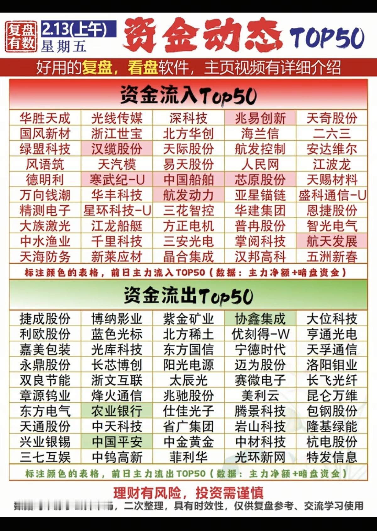 2.13周五 主力大资金 抢筹出逃个股榜! 资金抢筹: 船舶制造,航天航空,半导体芯片,造纸印刷,计算机设备等。 资金出逃: CPO,光通信模块,小金属,采掘行业,光伏设备等资金出逃