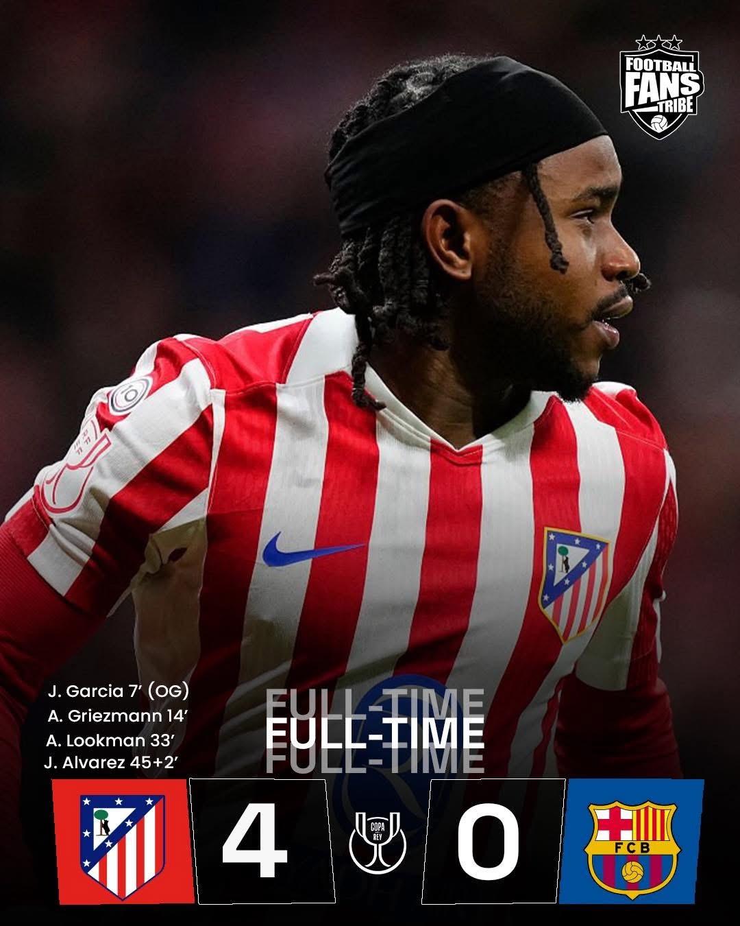控球唔需要多,最緊要實際!全場10次埋門8次中目標4粒入波足矣,馬德里體育會今日凌晨坐鎮主場嘅國王盃準決賽首回合賽事,大炒巴塞隆拿4蛋,客隊想喺次回合翻盤基本上得番幻想。睇下「床單軍」有無機會自2012/13球季後,再奪該項殊榮…