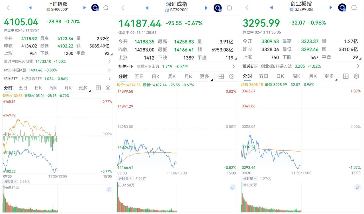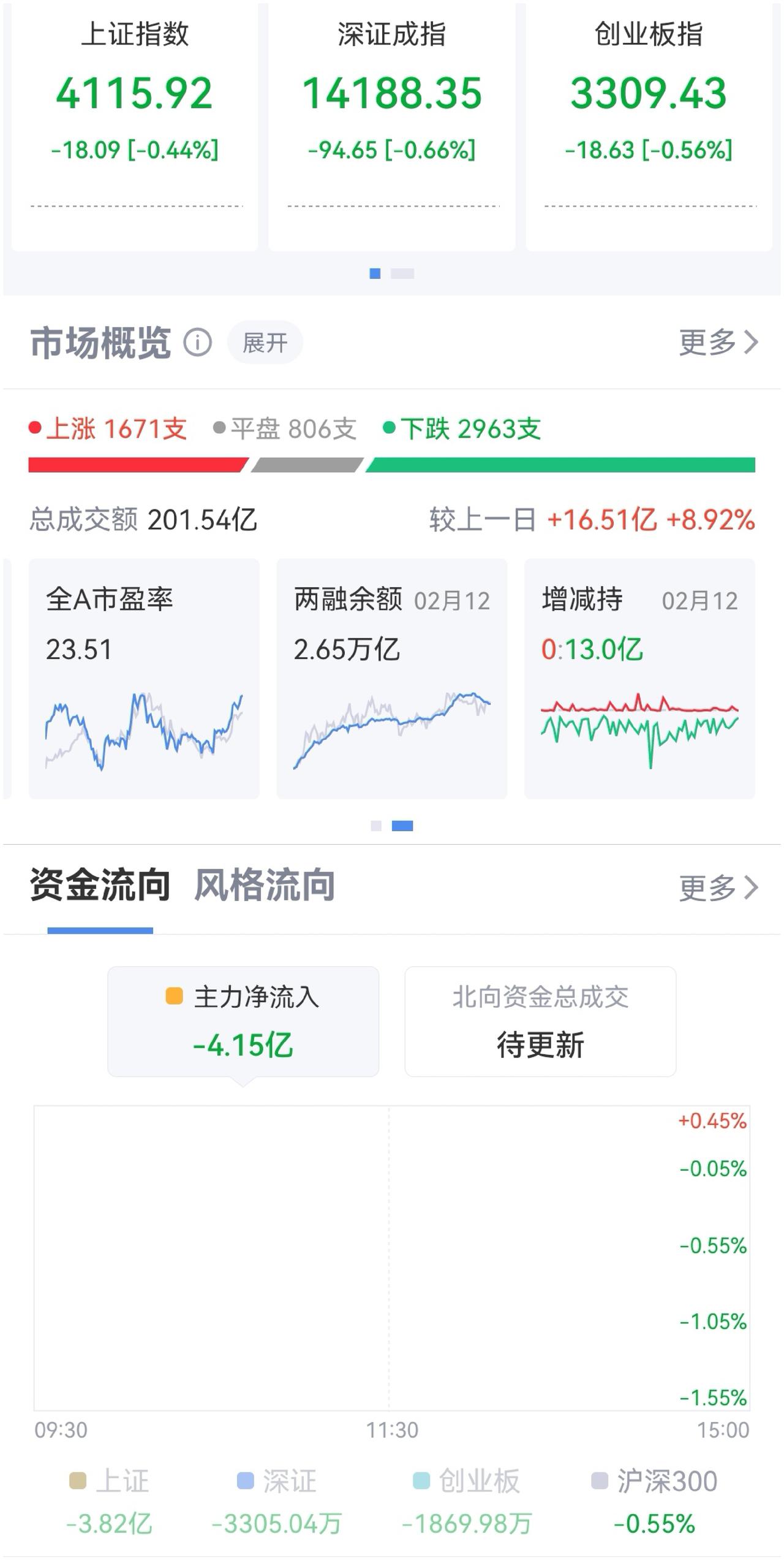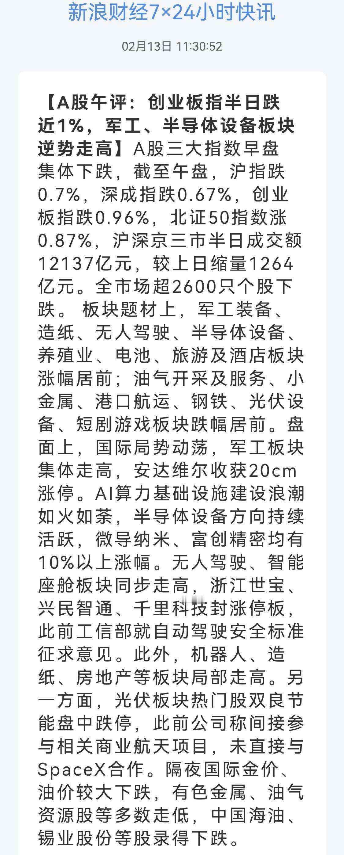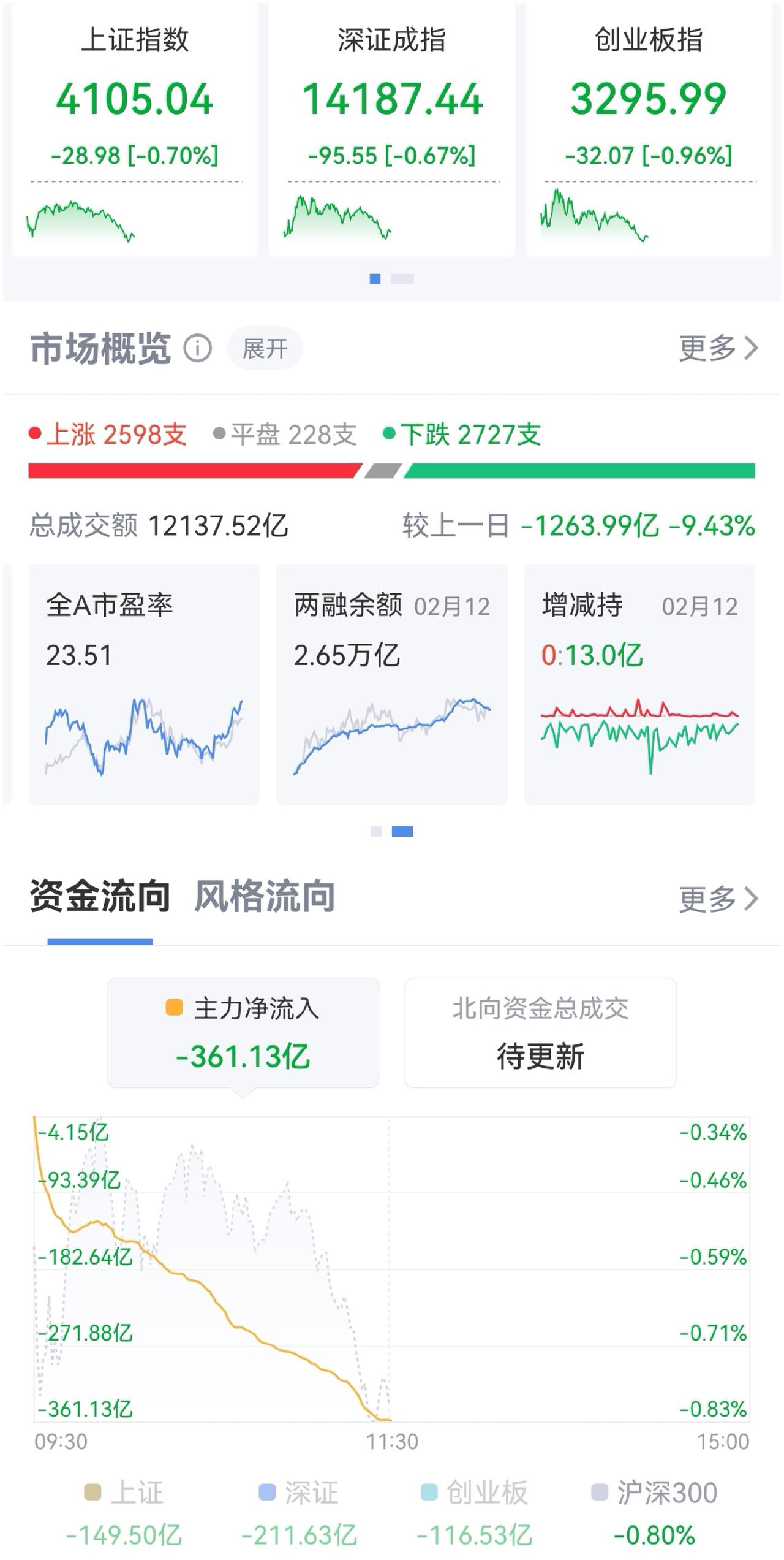 午盘印象(2月13日) 科技分化 外资节日避险 外围:美股大跌 科技弱势回调 内股:科技分化无领军 权重回调机构降仓位 一、三大股指开跌: 指数开盘弱势 个股开盘涨平跌比率31%:15%:54%。 个股开盘均势(-24 Vs +5个百分点), 个股也弱势 二、早盘指数低迷 低开回升无力午前又跳水 半日刚超1.2万亿,量能大减指数回调 三、涨跌幅榜: 科技分化 红利非银调整 跌幅前列:红利、光伏、金属、CPO 涨幅前列:国防军工、机器人、消费 四、开盘和午盘: 开盘:沪-0.44%、深-0.66%、创-0.56%。 午盘:沪-0.70%、深-0.67%、创-0.96%。 低开又走低 五、午盘个股上涨近47%,与昨日涨跌差距(-2 Vs +2个百分点),稍许萎缩 相比开盘,涨跌差回升,上涨个股增长较大 资金-361 ( -0 )亿,资金流出大幅扩张 六、沪深两市成交量午盘12,039亿,上个交易日13,295亿,同比量能萎缩近1,300亿,量能仍未完全稳定,继续下降中。 七、指数收跌,个股稍胜大盘 融资额11天9降、昨日+15亿,调控停止,杠杠稍稳,昨日反弹。最后交易日,早盘走出外资降仓位避险模式 午后两种情形: 1、横盘震荡:低位企稳,震荡消化,时间换空间。 2、震荡下跌:节日期间,市场避险,慢牛格局未变。 (图片源自网络侵权告知删除)