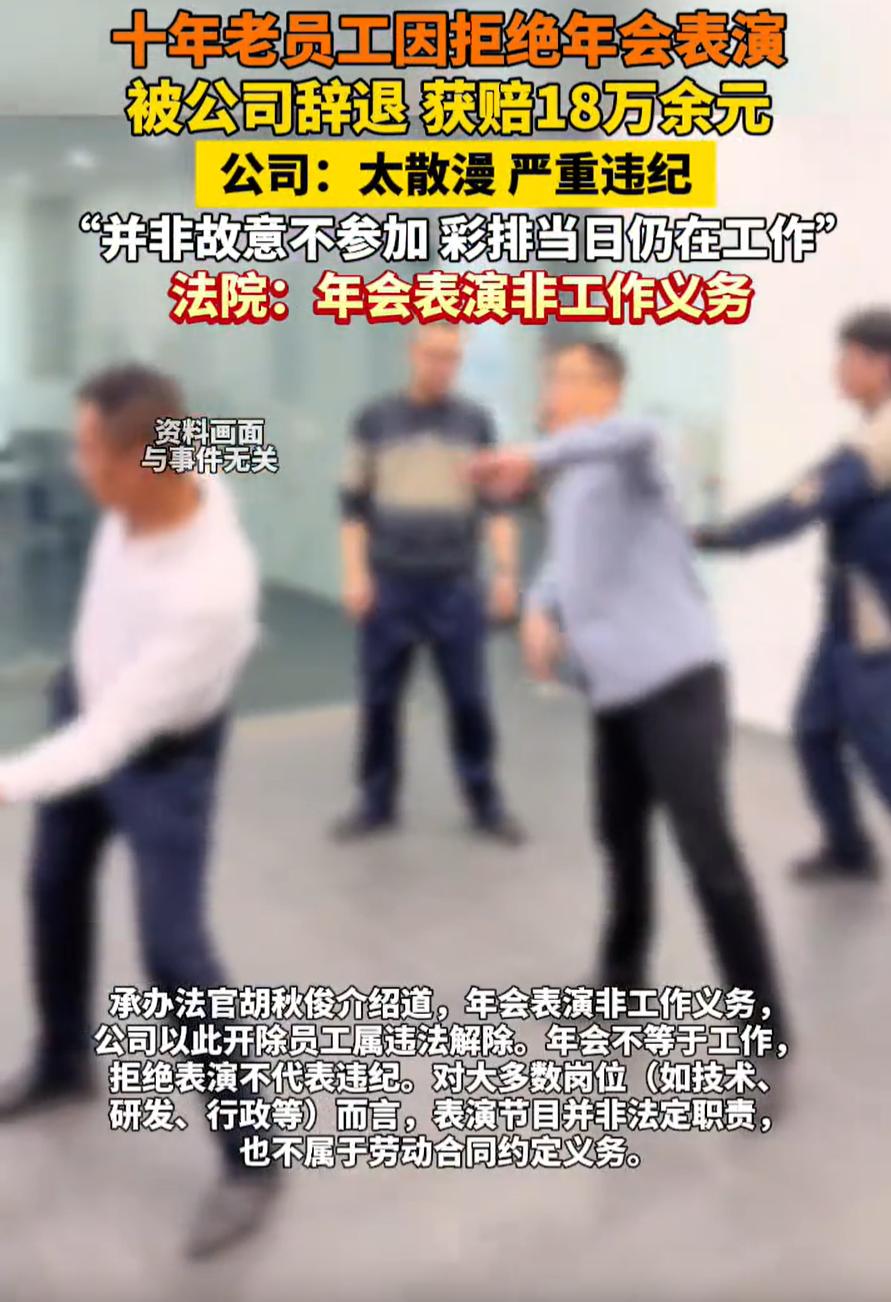 这公司格局小了!湖北武汉,一男子在公司工作10年,年底公司办年会让他表演节目,男子不但拒绝,甚至连年会都没有参加,结果被公司直接辞退,男子不服,反手就把公司起诉,最终获赔18万余元 老王在这家公司待了整整十年,十年什么概念?从一个年轻小伙熬成了公司里的老人。他平时话不多,活儿干得也还行,没想着靠拍马屁升官发财,就想安安稳稳把班上到拿退休金那天 前不久公司让他演节目,老王二话不说就拒绝了,这本来是个很正常的拒绝,毕竟,参加文娱活动并不是每个人的职责,更不是工作的一部分 结果,王先生的公司却以他“拒绝参与年会表演”为由,解除了劳动合同,称他严重违反了公司规定 王先生不服,觉得公司这一做法太过于强硬,侵犯了他的个人权利,毕竟参加年会不等于工作,怎么能因为这个就解雇员工呢? 于是,他提起了劳动仲裁,最终仲裁判定公司解除合同的行为违法,要求赔偿王先生20万多元。可公司显然不服这个结果,于是又提起了上诉。经过一番拉锯,最后双方在二审法院调解下达成了协议,公司支付王先生18万多元的赔偿 说起来,在一些公司,年会、团建等活动可能被当作团队凝聚力和文化建设的一部分,然而如果员工明确表示自己不愿意参与,是否应该因为此而受到惩罚?这确实值得讨论 在我看来,年会本来不该是这副样子。它的初衷是把一年到头各忙各的人聚在一起,好好吃顿饭,聊聊闲天,说说明年。不是让员工白天干完活,晚上加班排练,还得在台上卖力逗领导笑 真正有人情味的公司,年会领导自己上台演,员工坐在底下吃;真正有底气的老板,不靠员工听话来证明自己说了算