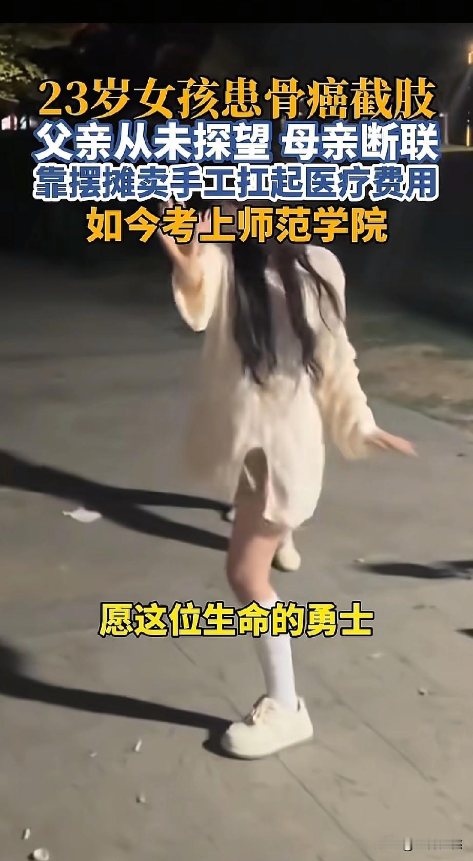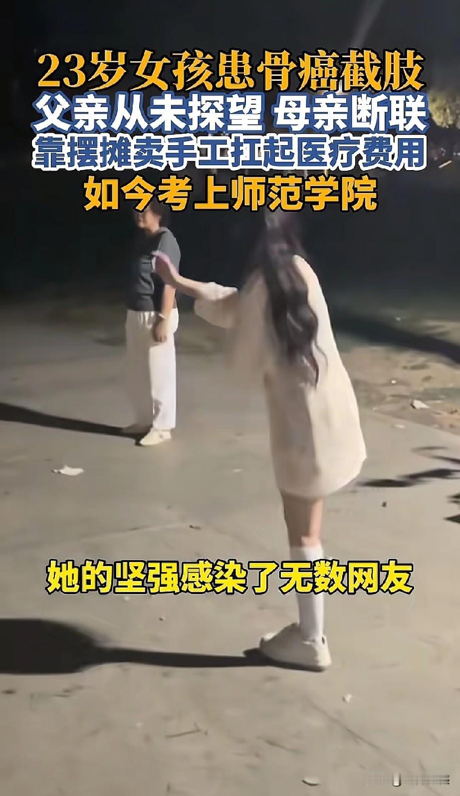 这个来自安徽的女孩,18岁身患骨癌,19岁做了截肢手术,可是自从患病做手术之后,父亲从来没有看过他,母亲也失联了,这个可怜的孩子无依无靠,只是一个人默默的与病魔做斗争,在这种情况下,她还以顽强的毅力考上了师范大学,是何等的不容易,现在她的病还没有得到有效的控制,病情还在不断的加重,但是她依然如此乐观,如此阳光!