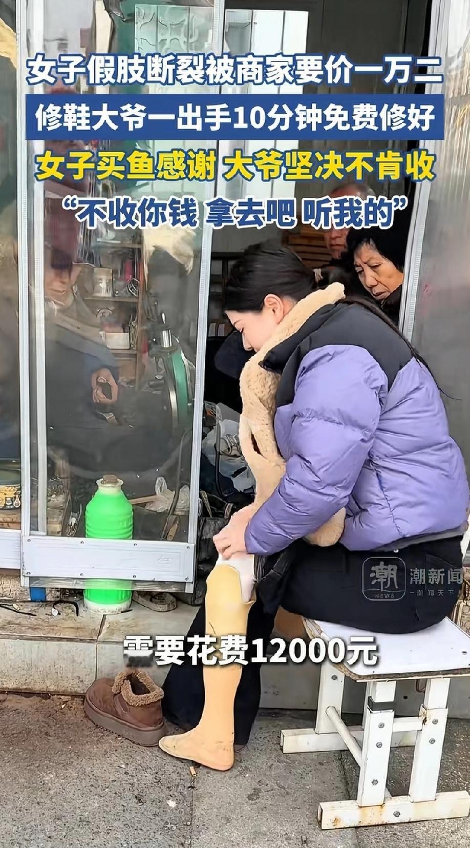 江苏无锡,女子的假肢脚底断裂,她想贴块皮加固一下,没想到商家竟表示只换不修,换下来需要12000元。这可不是一笔小数目,女子舍不得,试着找路边修鞋的大爷问了问,出乎意料的是,大爷10分钟就给她免费修好了,还做了加固防滑。女子送鱼感谢大爷,大爷说什么也不肯收。 刘女士22年前因为一场车祸失去了一条腿,从那以后就一直靠着假肢生活。 这些年她靠着自己的努力打工谋生,假肢就是她平日里最离不开的“腿”,可谁知道,这天天用的假肢,突然就出了大问题。 这天,刘女士发现自己假肢的脚底直接断裂了,这可把她急坏了。没有假肢,她连正常走路、出门打工都做不到,生活一下子就陷入了麻烦。 她赶紧联系了之前买假肢的商家,想着让对方帮忙修一下,哪怕简单贴块皮加固一下也行,只要能继续用就好。 可商家的答复,让刘女士心凉了半截。 商家明确说,假肢只换不修,想要继续用,就得花12000元换个新的。 12000元,对于靠打工过日子的刘女士来说,可不是一笔小数目,她实在舍不得拿出这么多钱,心里又着急又无奈。 不换吧,没法正常生活;换吧,这笔钱又让她难以承受,一时间刘女士不知道该怎么办才好。 就在刘女士一筹莫展的时候,她路过街边,看到了一位常年摆摊的修鞋大爷,手艺看着还不错,说不定能有办法修好假肢,哪怕只是简单加固一下也行。 于是抱着试一试的心态,刘女士忐忑地走到大爷摊前,把假肢断裂的情况跟大爷说了,还说出了商家要价一万二换新的事,语气里满是无助。 大爷听完刘女士的话,看着她着急的样子,二话不说就接过了假肢。 大爷其实从来没修过假肢,可他没有推脱,仔细看了看断裂的位置,就动手忙活起来。 涂胶、裁剪材料、细心打磨,每一步都做得格外认真,不光把断裂的地方严丝合缝地修好,还贴心地给假肢做了加固处理,最后还钉上了防滑垫,生怕刘女士之后走路打滑。 短短十分钟,原本断裂没法用的假肢,就被大爷修得结结实实,比之前还要牢固。 刘女士看着修好的假肢,又惊喜又感动,连忙拿出钱要给大爷,可大爷却一个劲地摆手,说什么也不肯收。 刘女士过意不去,想着大爷帮了自己这么大的忙,一分钱不收实在说不过去,就特意去买了几条新鲜的鲫鱼,送到大爷的摊位上,想以此表达自己的感谢。 可大爷还是坚决拒绝,语气坚定地对刘女士说:不收你钱,拿去吧,听我的! 一边是只换不修的商家,开口就索要12000元,一边是好心的修鞋大爷,十分钟免费修好,还贴心加固防滑,这么一对比,大爷的行为让刘女士心里暖暖的。 她一直记着大爷的这份恩情,想着等过完年,一定要再去好好感谢这位善良的修鞋大爷。 《消费者权益保护法》第二十四条规定:经营者提供的商品或者服务不符合质量要求的,消费者可以依照国家规定、当事人约定退货,或者要求经营者履行更换、修理等义务。 假肢属于耐用消费品、残疾人辅助器具,商家负有售后维修义务,“只换不修”并非法定免责理由。 而且,假肢仅脚底断裂,具备可维修性,修鞋大爷10分钟即可修复,证明故障轻微、维修成本极低。 商家以“只换不修”为由,无理拒绝合理维修请求,强制消费者支付12000元换新,属于剥夺消费者选择权、附加不合理交易条件,违反法律规定。 更气人的是,商家面对残疾消费者的求助,不看困难、只看利润,明知小故障可修,却故意设置“只换不修”门槛,索要12000元高价,本质是利用残疾人对假肢的刚需进行商业拿捏。 刘女士车祸致残、打工维生,本就生活不易,商家不仅没有基本同情,反而把售后变成“宰客”,冷漠又逐利。 对比之下,修鞋大爷无利可图,却出手相助、分文不取,用最朴素的手艺与善意,解决了她的生存难题。 不收钱、不收鱼,只讲良心不问回报,这份温暖恰恰照出商家的凉薄。 一件小事,却藏着最朴素的善意,修鞋大爷没有多说什么漂亮话,却用实实在在的行动,帮刘女士解决了大难题,这份不求回报的好心,也让身边的人都觉得格外暖心。